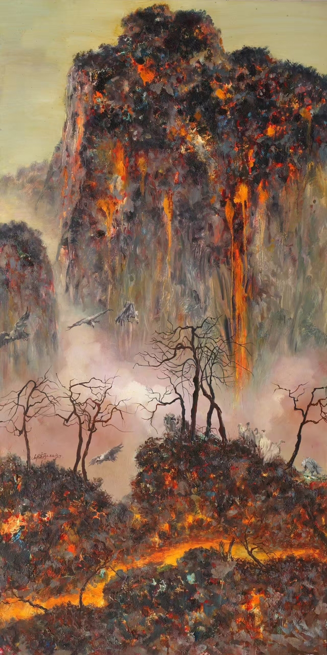 与当下许多过度沉溺于日常生活图景、渲染世俗感情欲望、张扬价值虚无的艺术创作形成鲜明反差,邱光平始终坚守着对精神与灵魂、生命意义与价值等终极问题的叩问与思考。在消费至上的时代浪潮中,他以自己的作品为阵地,对世俗图景的诱惑保持警觉,拒绝叙事的浅表化,抵御对现实的盲目认同,构建起充满矛盾与张力的精神图像,在这“不合时流”的创作中,高扬着超越流俗的真正前卫精神与意识。
