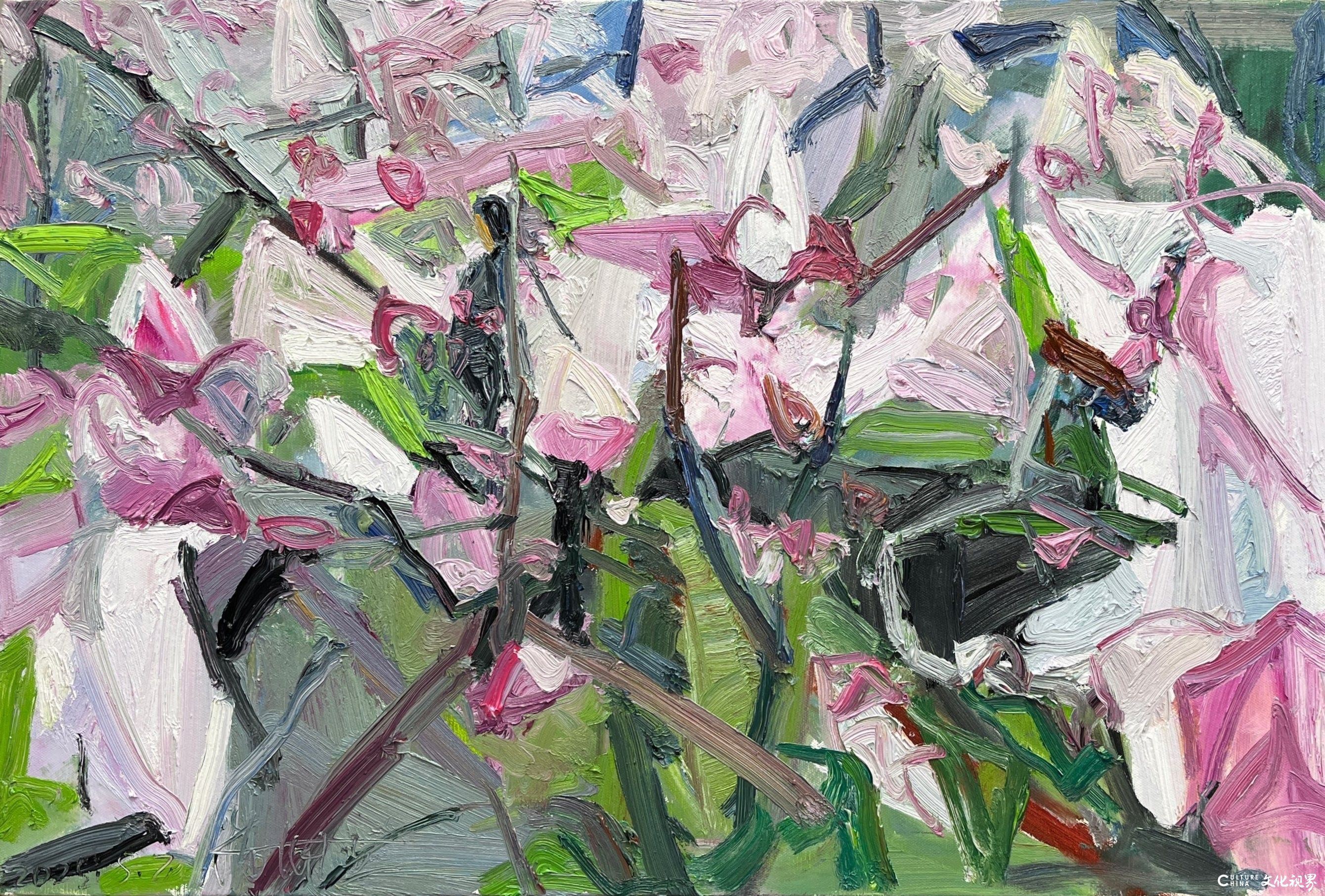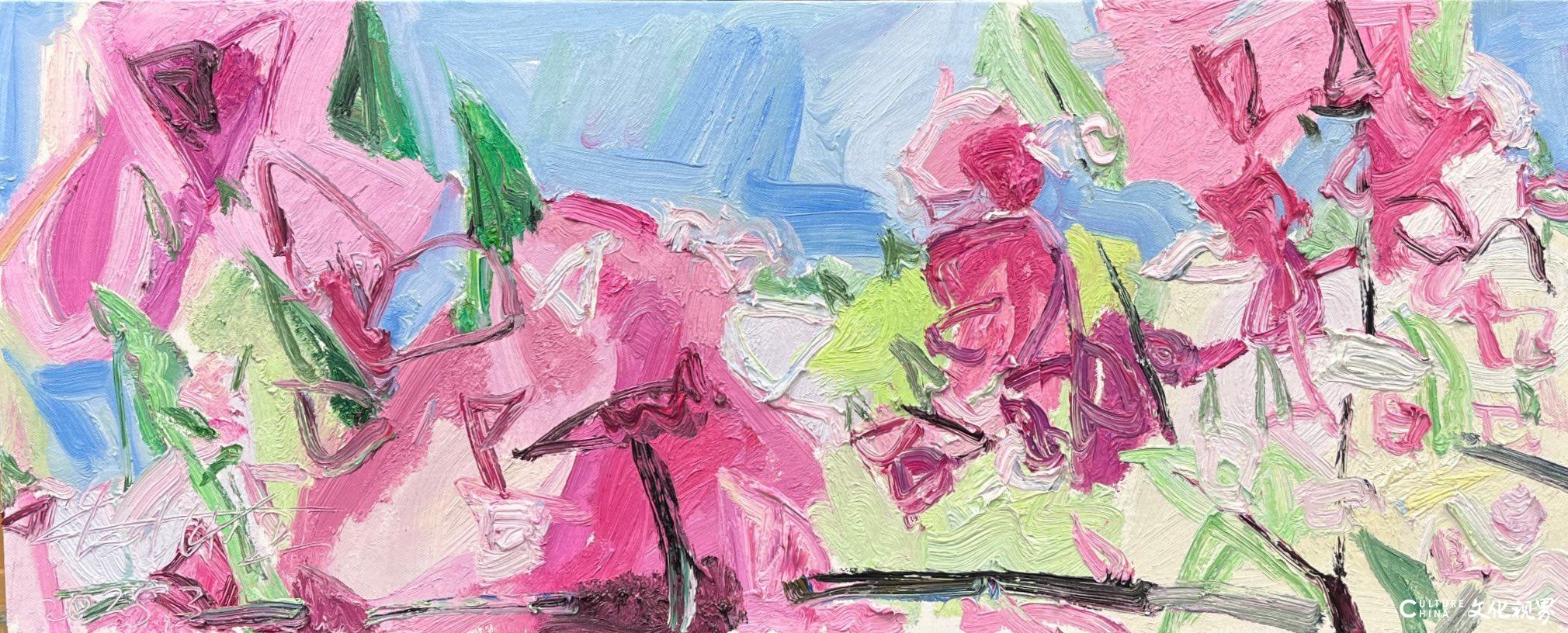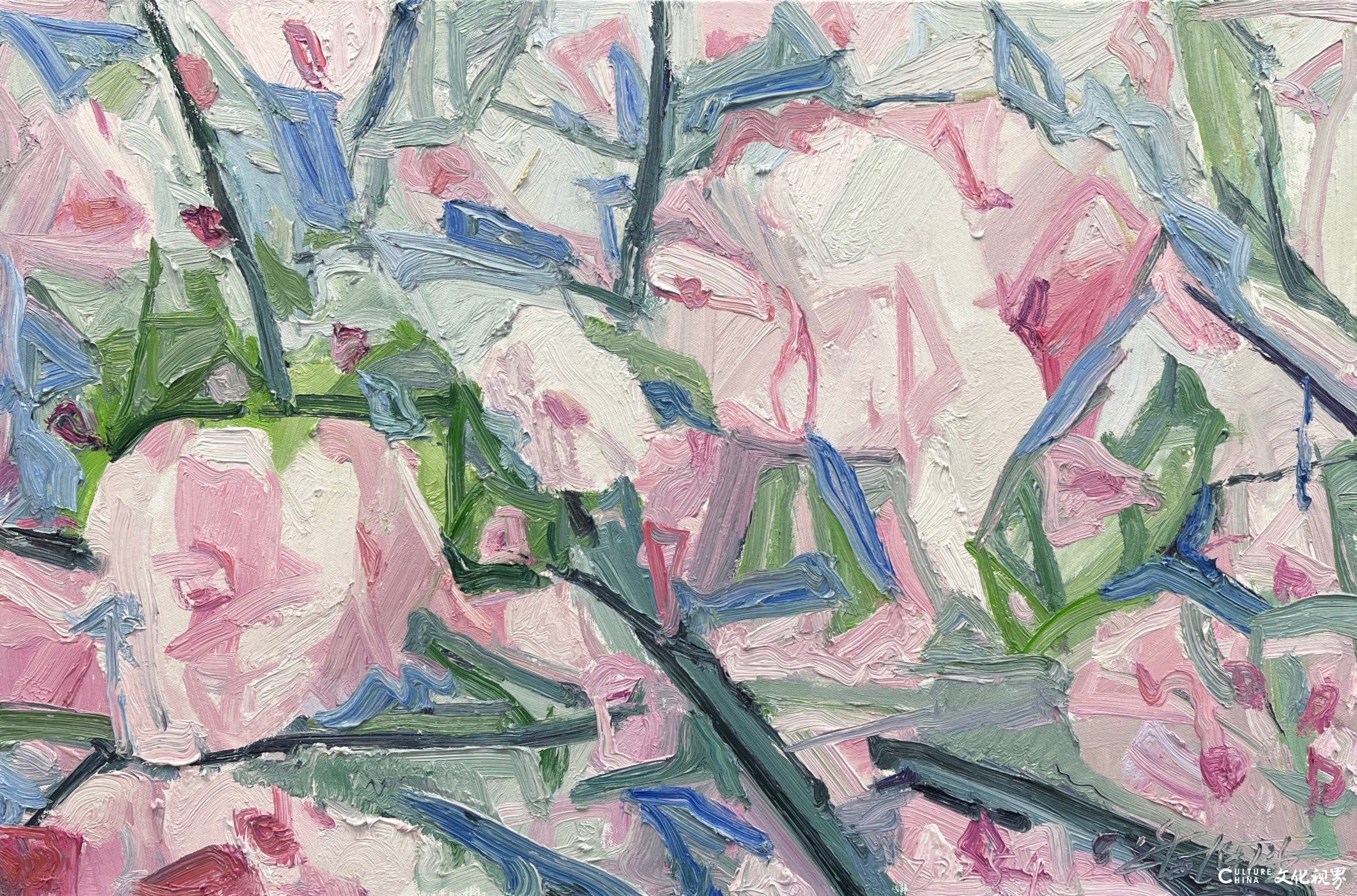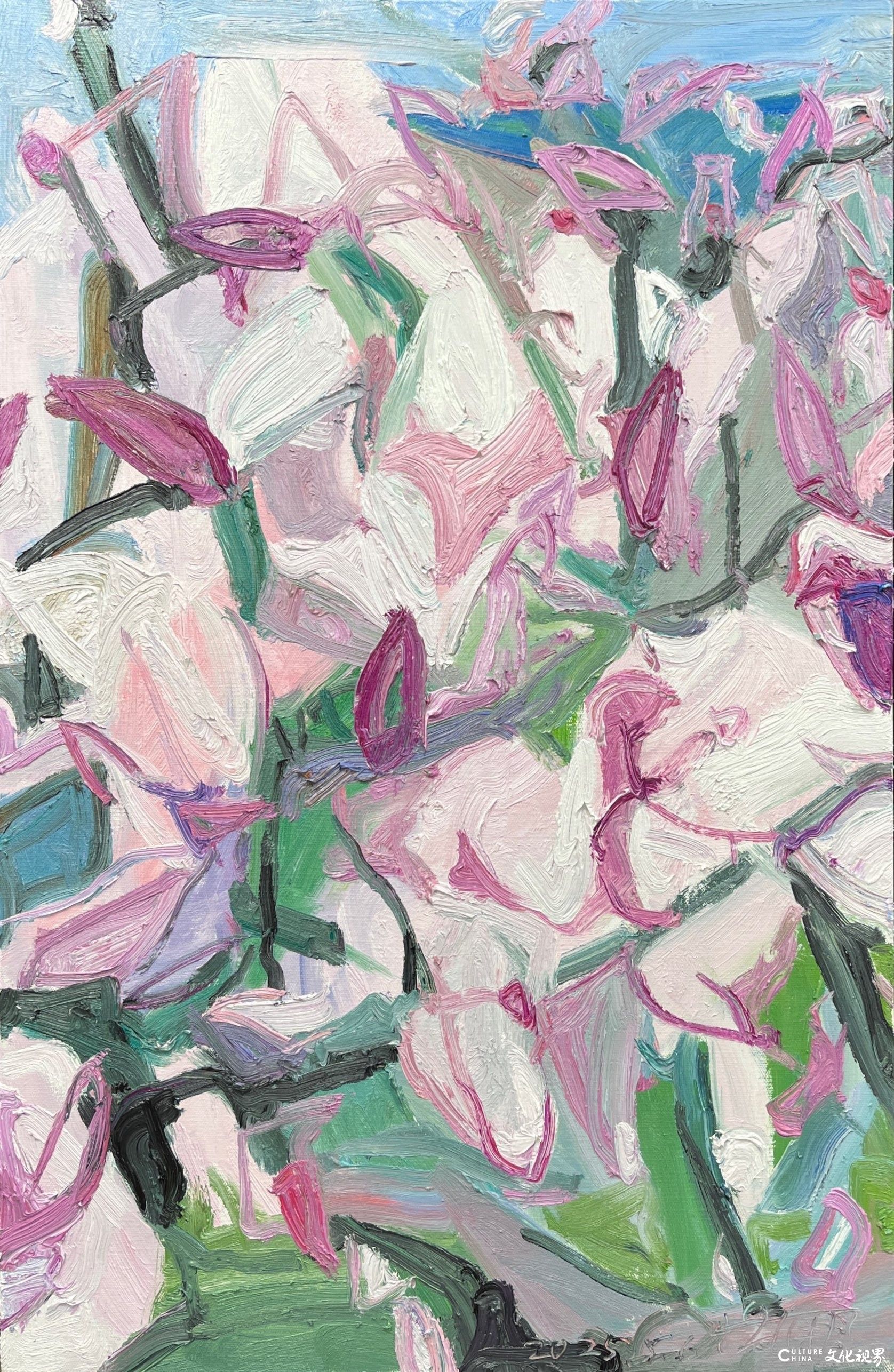 潘闻丞的笔触带着中国书法的基因。他将油画的厚重笔触转化为水墨的写意性,在画布上演绎着“疏可走马,密不透风”的构图智慧。花瓣的边缘很少有清晰的轮廓线,而是在虚实之间自然晕染,似被时光磨去了所有锋利;枝叶的穿插看似随性,却暗合着传统绘画中“开合呼应”的美学法则,在简笔勾勒中见出匠心。这种对“书写性”的追求,让花卉从静态的物象转化为动态的精神符号——有的如行草般流畅洒脱,有的似隶书般庄重典雅,每一笔触都承载着创作者当下的心境,使画面成为流动的情感心电图。当西方油画的材质遇上东方的写意精神,诞生的不是生硬的嫁接,而是一场浑然天成的美学联姻。
