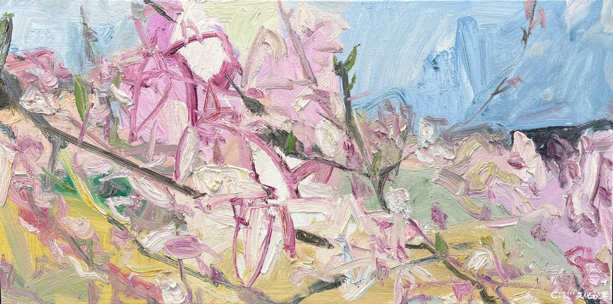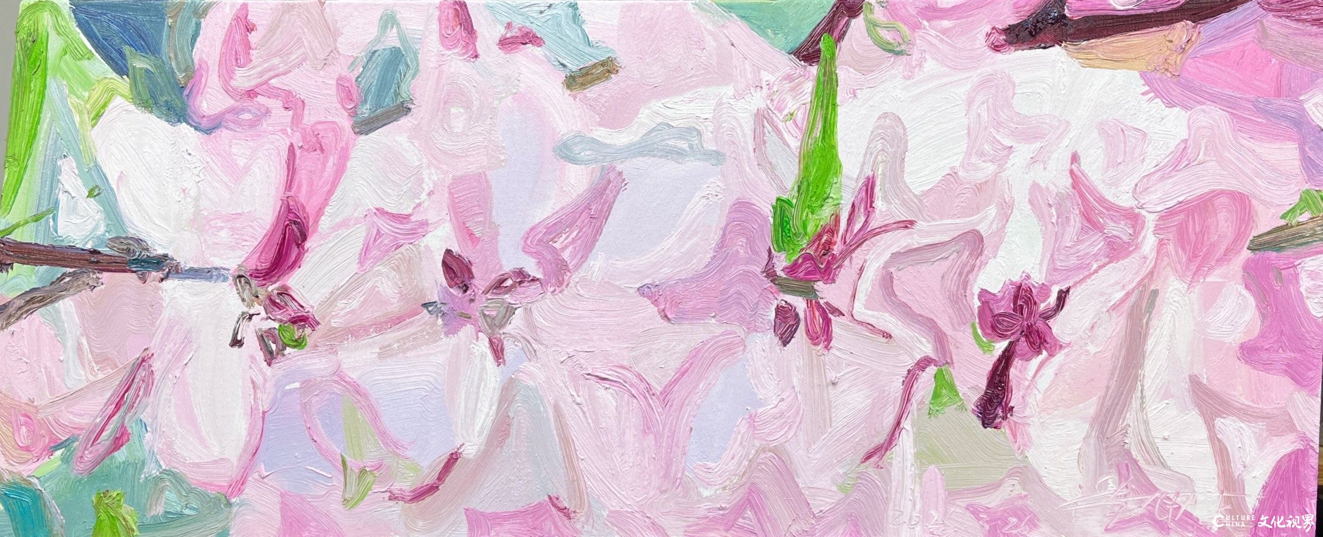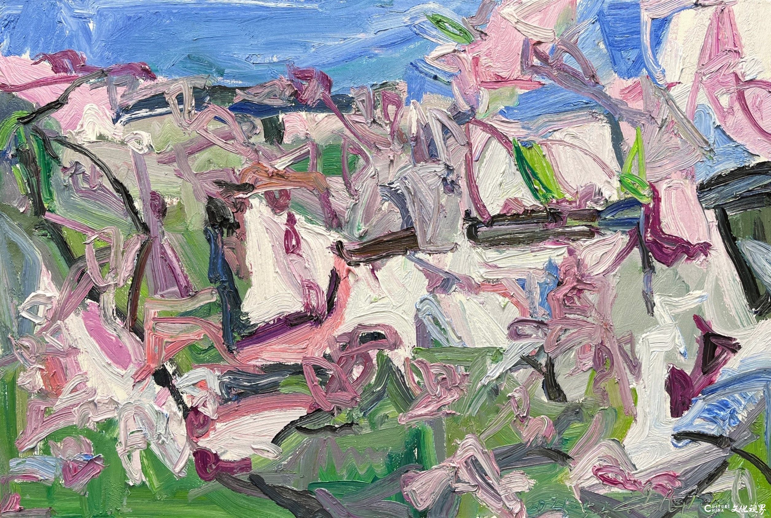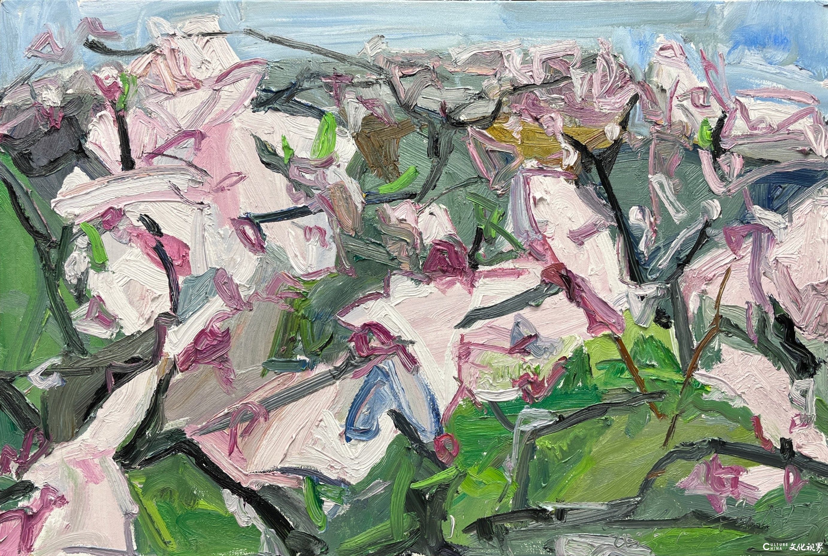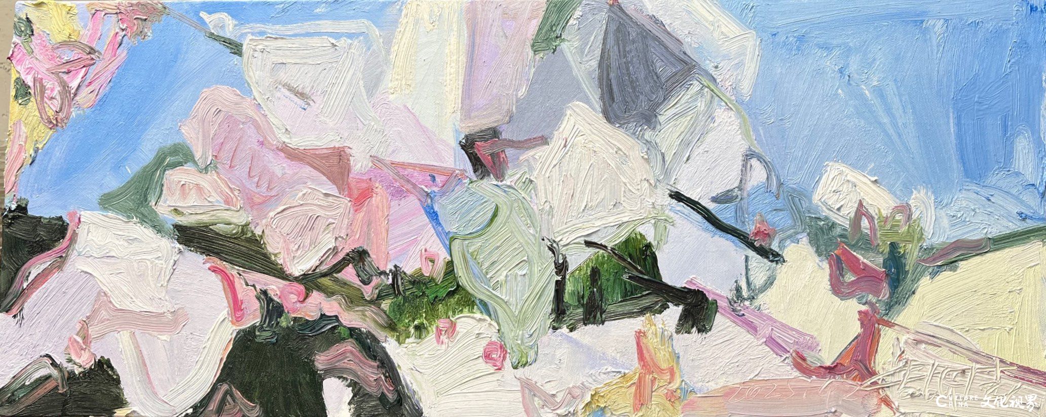 潘闻丞的笔触带着中国书法的基因。他将油画的厚重笔触转化为水墨的写意性,在画布上演绎着“疏可走马,密不透风”的构图智慧。花瓣的边缘很少有清晰的轮廓线,而是在虚实之间自然晕染,似被时光磨去了所有锋利;枝叶的穿插看似随性,却暗合着传统绘画中“开合呼应”的美学法则,在简笔勾勒中见出匠心。这种对“书写性”的追求,让花卉从静态的物象转化为动态的精神符号——有的如行草般流畅洒脱,有的似隶书般庄重典雅,每一笔触都承载着创作者当下的心境,使画面成为流动的情感心电图。当西方油画的材质遇上东方的写意精神,诞生的不是生硬的嫁接,而是一场浑然天成的美学联姻。