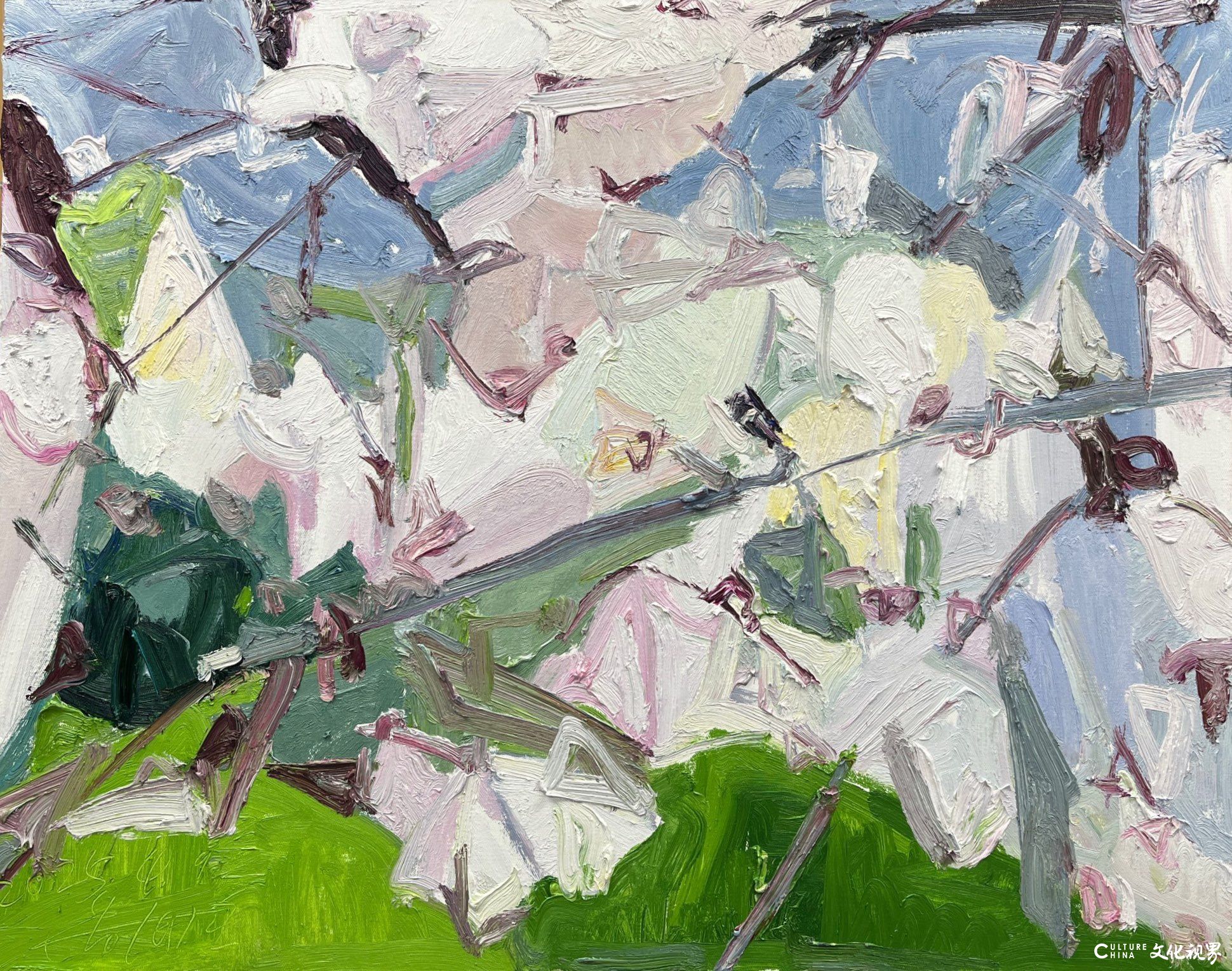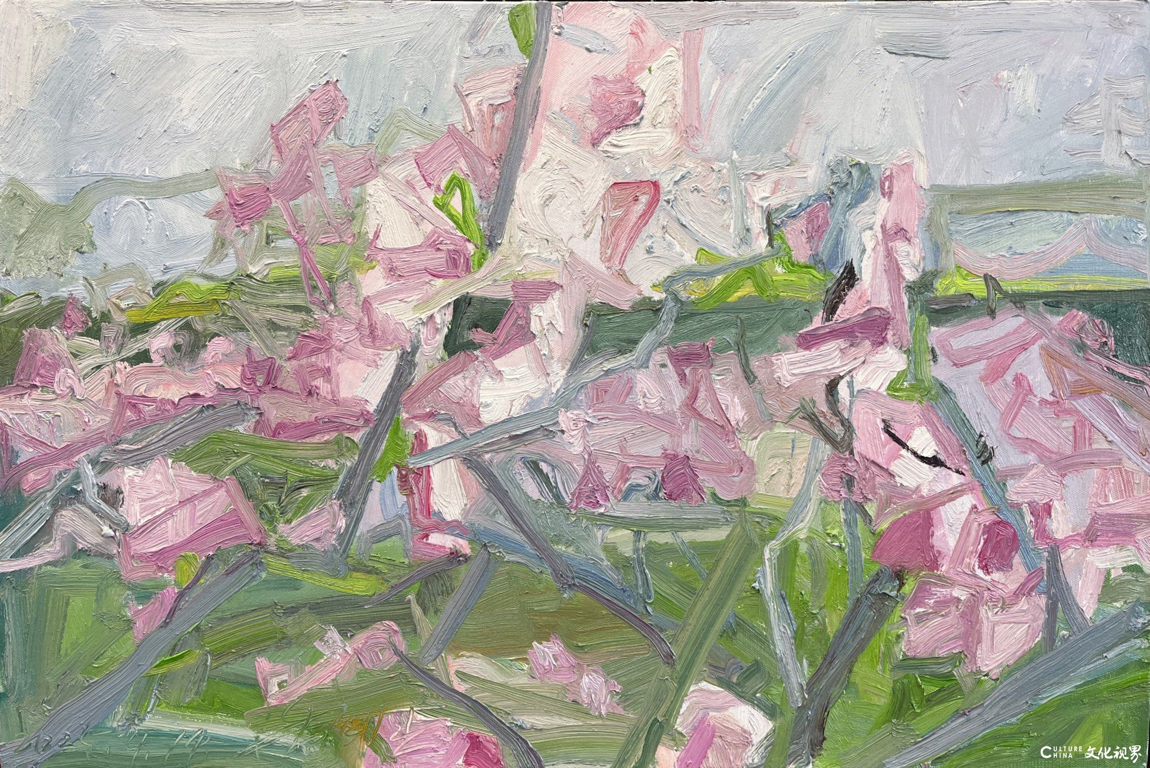 潘闻丞的花卉系列是一场静默的视觉修行。当画布上的姹紫嫣红沦为消费主义的视觉符号,他却选择在低饱和度的灰度世界里栽种精神的花园。那些被提炼为色块与线条的花朵,既是对自然生命的诗意转译,更是东方美学在油画媒介中的当代显影——他以画笔为舟,在东西方艺术的河流上摆渡,让花卉超越了植物学的定义,成为承载情感与哲思的精神载体。