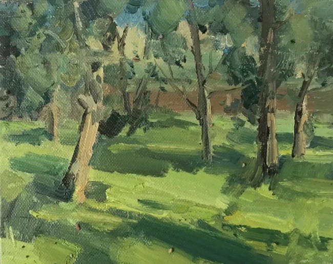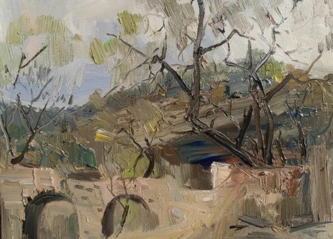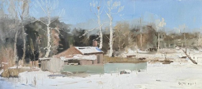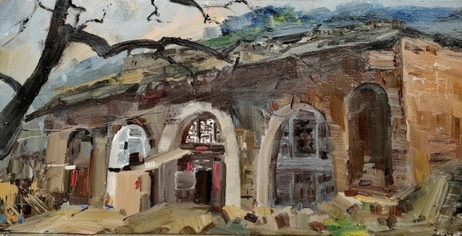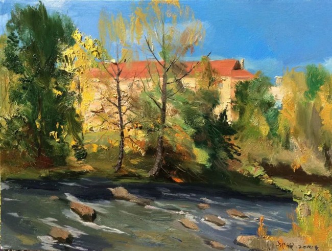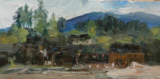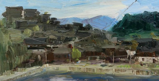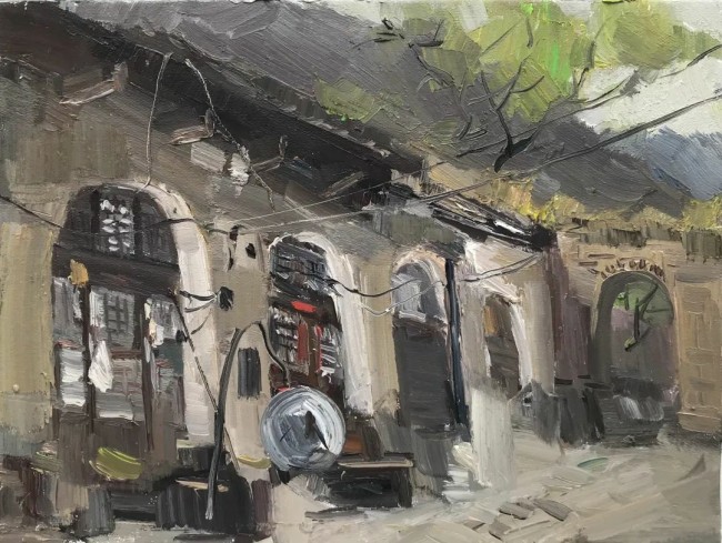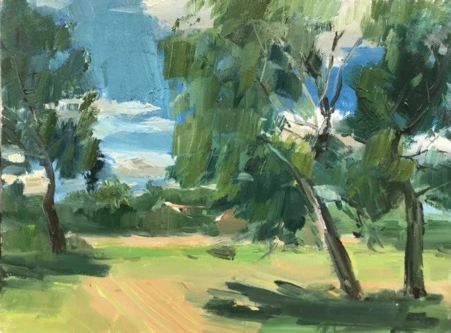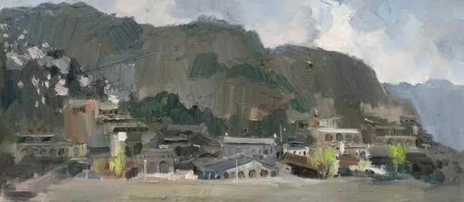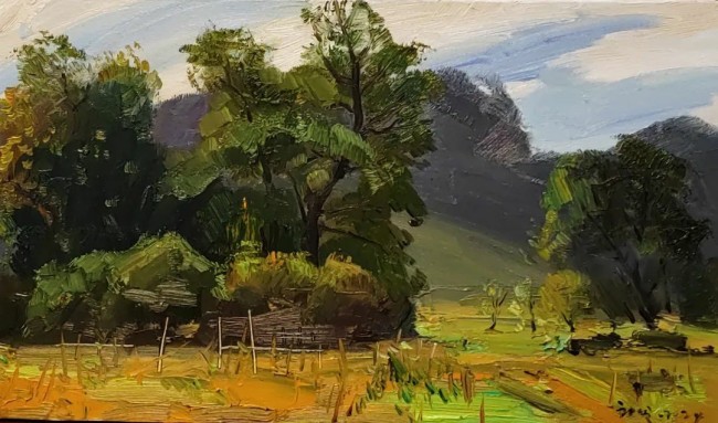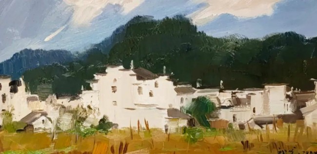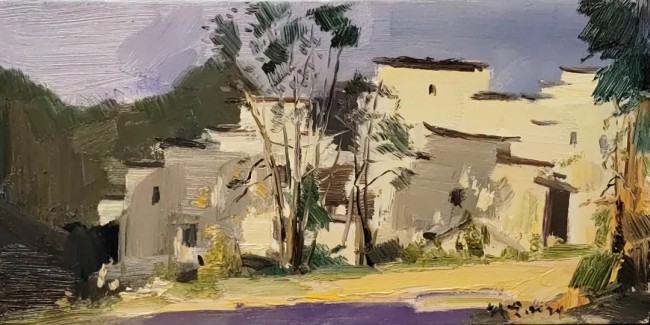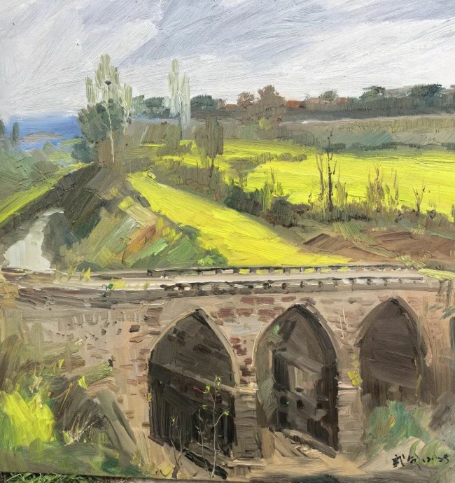 在周武发先生的写生作品中,我们能看到他对自然的深刻理解与独特诠释。他的画面,大面积的色块相互交织,简洁的笔触勾勒出景物的轮廓,线条的组合让画面充满了韵律感。这些看似随意的表达,实则蕴含着他对艺术的深刻思考和精湛技艺。他的作品,既展现了自然景观的真实面貌,又融入了自己内心的情感与色彩,营造出一种幽静、甜郁而又丰富的氛围。