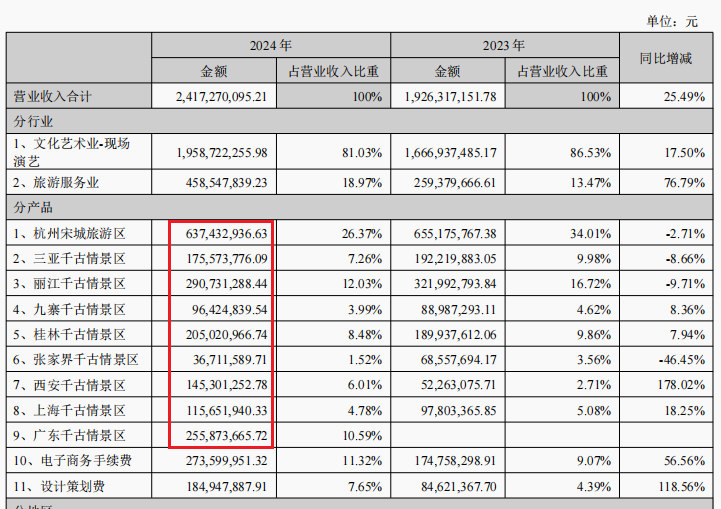 随着旅游业的复苏,热门打卡地以及二三线小城市不断出圈,这一策略的确奏效。据其财报显示,2024年旗下新项目西安千古情、上海千古情和广州千古情的营收分别同比增长178.02%、18.25%和10.6%,新项目给其贡献了增量。