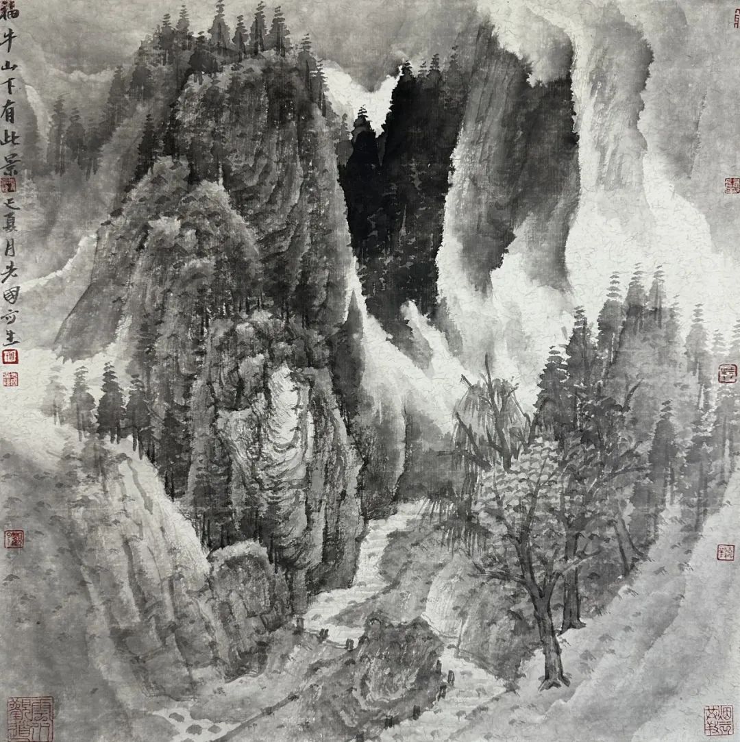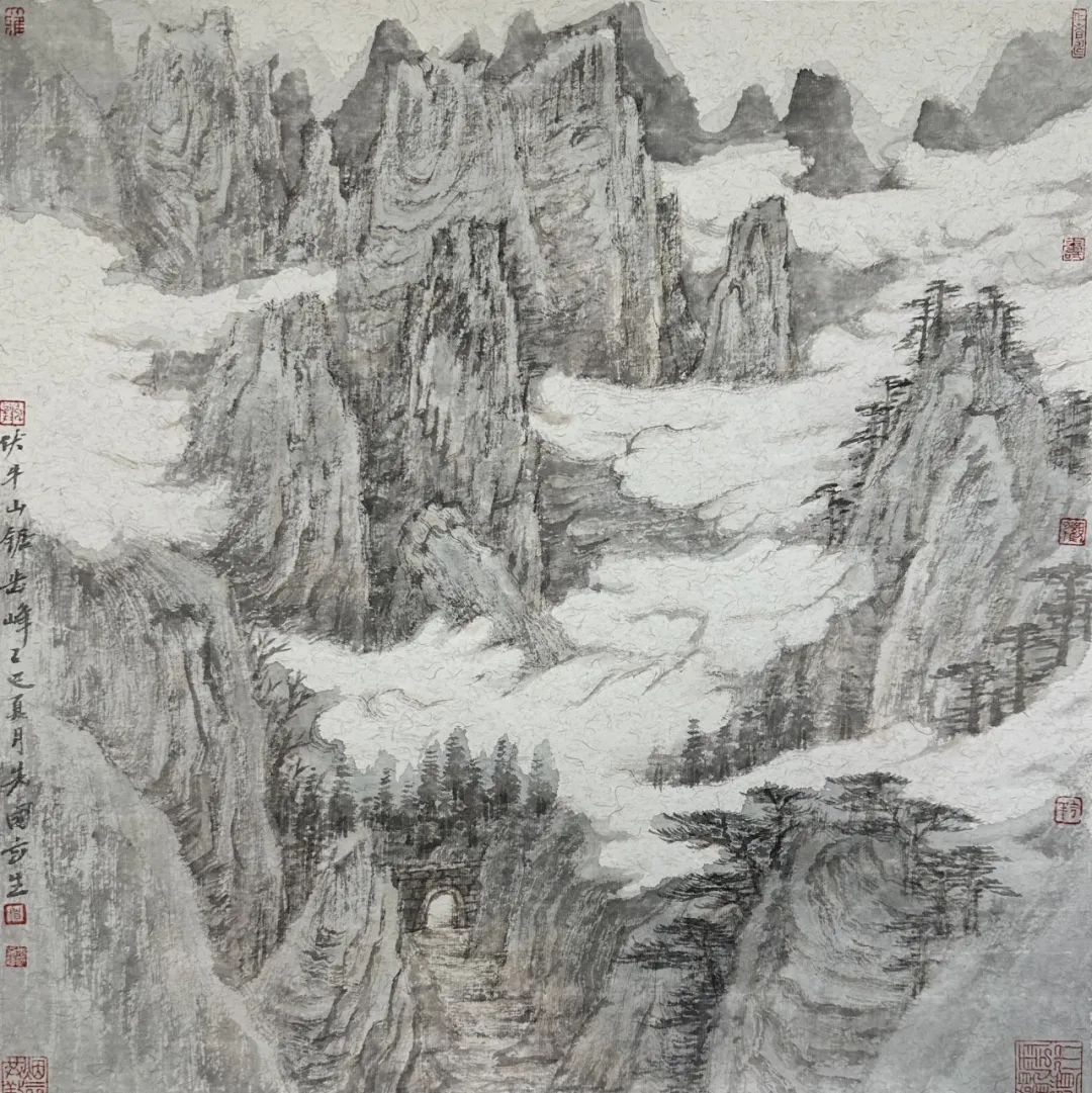 曾先国的西峡写生始终贯穿着南北美学的对话意识。他以北方山水的雄浑为骨,用浓墨勾勒伏牛山系的磅礴山势,皴法的块面结构与墨色的层叠堆积,让山体呈现出如青铜器般的厚重质感,暗合传统画论中“石分三面”的空间意识。与此同时,他又以南方山水的秀润为魂,在云雾处理上突破北派山水的刚硬边界,以淡墨轻染与留白技法营造出“云气生壁间”的朦胧意境。这种美学融合并非简单的风格拼贴,而是通过笔墨韵律的辩证统一——让巍峨山势在流动的云气中消解棱角,使秀润烟岚因坚实的山体结构获得支撑——最终形成“刚柔相济”的视觉张力。在色彩运用上,他更打破传统水墨的黑白体系,将青绿、赭石等矿物色融入意象化表达,让西峡的秋峦、溪涧在宣纸上既保持水墨的氤氲韵味,又焕发出现代视觉的色彩冲击力,使地域自然特征通过“意象色彩”的转译,升华为超越地理属性的精神符号。