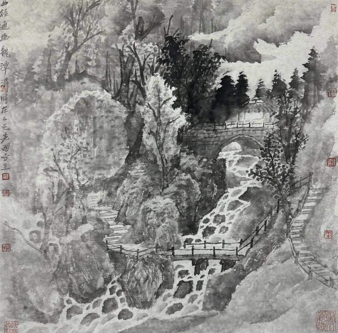 西峡作为楚文化与中原文化的交汇地,其历史纵深为曾先国的创作提供了丰饶的文化土壤。他笔下的山水并非纯粹的自然景观,而是镌刻着地域记忆的文化载体——那些隐现于山间的古驿道、浸润着传说的溪潭、与自然共生的村落民居,都在笔墨中转化为可感知的历史符号。他以山水为画布,将屈原岗的楚辞遗韵、黄石庵的隐逸精神、伏牛山的生态意涵,通过构图的经营与笔墨的皴擦,编织成兼具视觉美感与文化厚度的图景。这种创作取向,既不同于脱离现实的传统文人画,也有别于侧重形式实验的现代水墨,而是在地域文化的根基上,构建起“山水即文脉”的当代叙事。在他的作品中,西峡的林木沟壑既是自然生态的缩影,也是“天人合一”哲学的具象化呈现——当他以细腻笔触描绘溪流中的卵石、枝头的宿鸟时,实则是以艺术的方式回应着当代社会对生态文明的思考,让传统山水精神在现代语境中焕发新的现实意义。