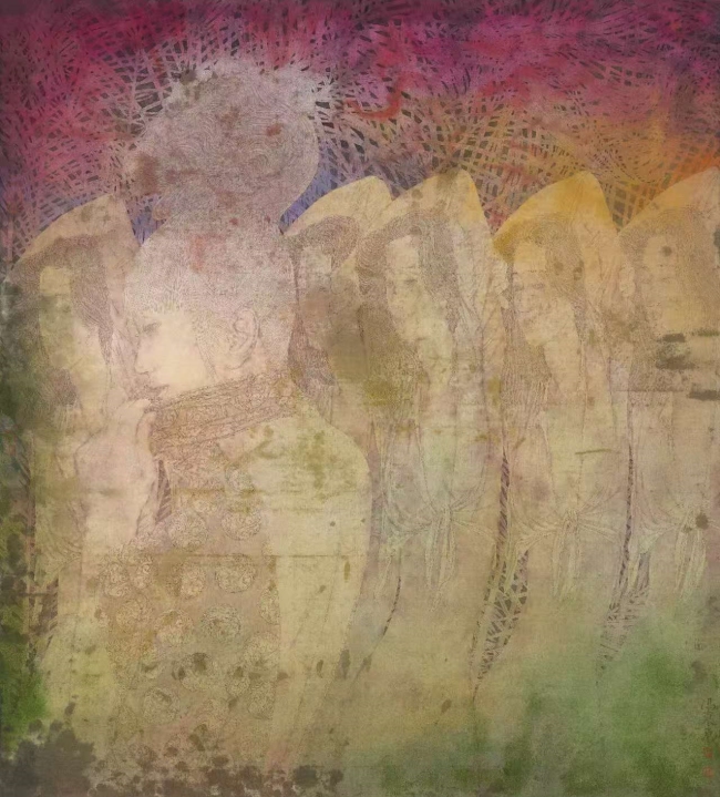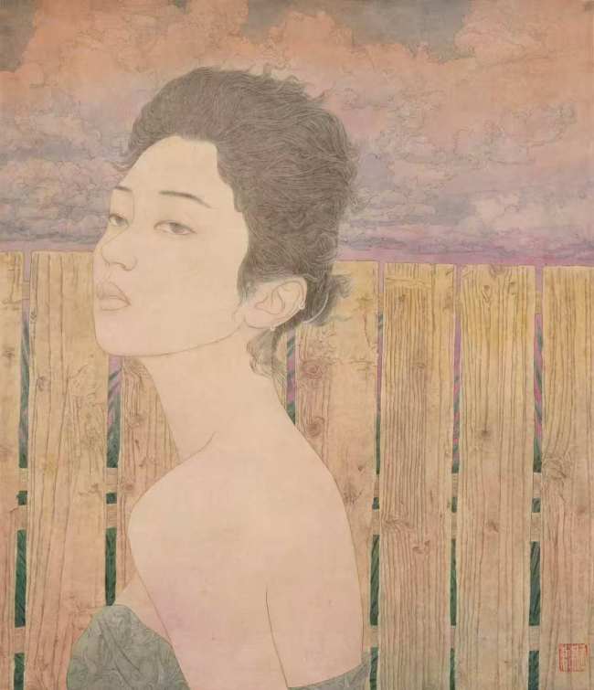 冯东东教师的创作深谙中国传统文化之精神,同时汲取西方艺术史的元素。他的作品无论工笔还是水墨,均意在洞察其中的深邃之处,揭示着人与自然之间互为维系的关系。冯东东作为一位新时代的画家,如何用体悟的绘画语言和方法展现心中的意境空间,如何用面对自然与东西方经典的姿态去表现心中的画面,才是他真正关心的问题。他的工笔人物画强调绘画中的耐读性,巧妙地利用形象和色彩,营造出了充满浓厚诗意的氛围,使得形象在空间中都带着若隐若现的趣味,不停地感染着我们心中的那份悸动。我们就在这样的墨色挥洒中体会到作者想带给我们有关空间的转换与时间的流动,最终在追求完美的幻觉语境中感受到属于他的风雅与意蕴。冯东东在宣纸上精心创作的水墨作品,其本质区别于传统意义上的中国画,展现出突破框架的视觉与独特的艺术气质。创作时,他倾注极强的专注力,不知疲倦地探索,在叠加的笔触中释放精神,追求水墨语言和中国画材料本身的张力。因此,他的水墨作品成为冥想状态下的产物,既有可追溯的根源,又与当代审美理念契合。通过对人物脸部微表情审慎、思辨地处理,既抵达了主观的真实,又超然于客观的尺度,进而深刻地表明了一种非常主观真实的存在。使得观众在观赏时无须在意画面中可能对人物所设定的文化空间属性,可以更加自由地将自我“带入”充满情绪氛围的臆造空间中游观。这些作品特别注重文化的时空意识在浪漫的想象中经营着画面美学的布局与空间转换,以自我内心的状态映射了对当代文化精神最深切的抒怀,于丰富的笔墨调性中表现了不可言说的神秘力量。