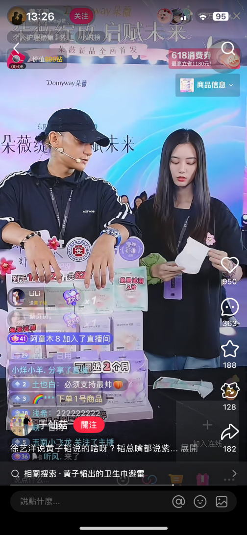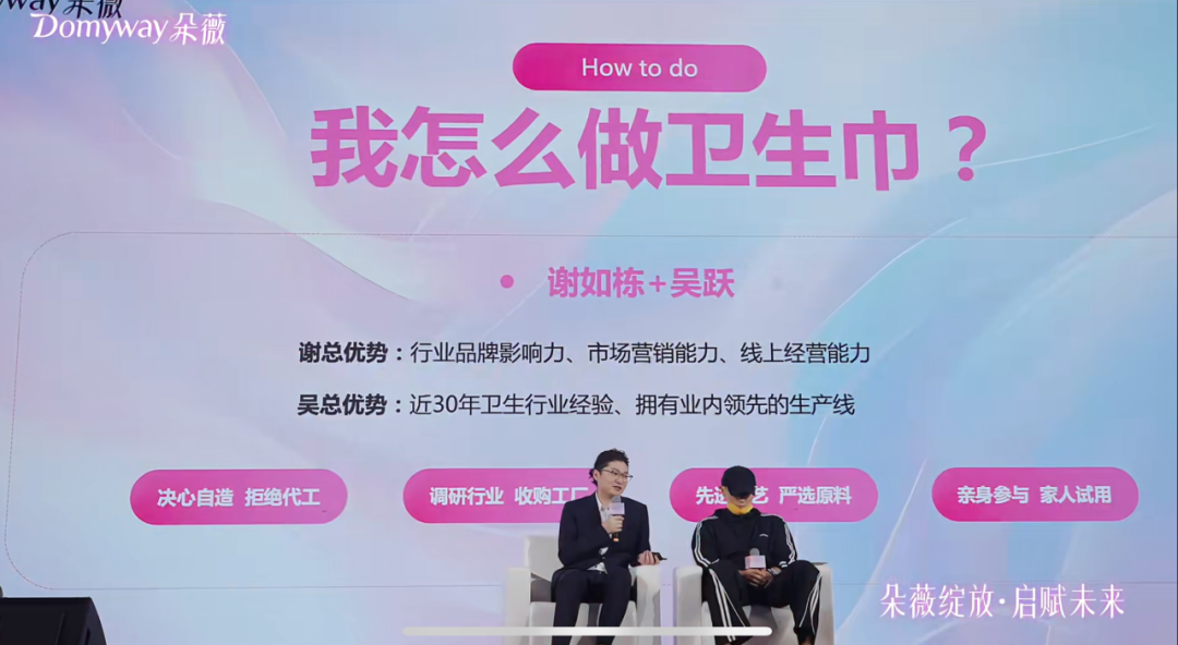 黄子韬的爱妻人设与徐艺洋的夫妻档模式,也为其朵薇提供了加成。如网友质疑“男性不该做卫生巾” 时,他当场连线妻子徐艺洋,公开其参与产品试用的细节,顺势展示了工厂消毒室的监控画面,并在直播中撕开卫生巾做吸水实验。