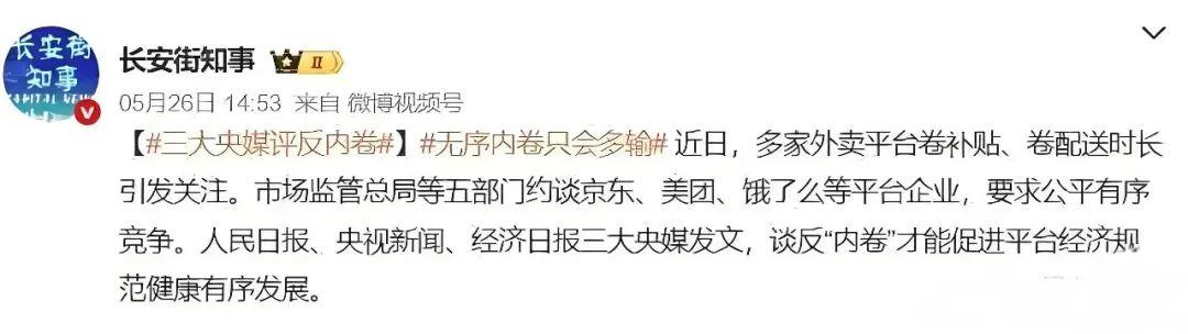 紧接着,“三大央媒”针对反内卷集体发声,鉴定表明反“内卷”才能促进平台经济规范健康有序发展。同时提出,低水平的“内卷式”竞争,会导致多输结局; 遵循商业底线,拒绝低价内卷和营销炒作,发挥就业“蓄水池”作用,才能更好助力行业健康发展。