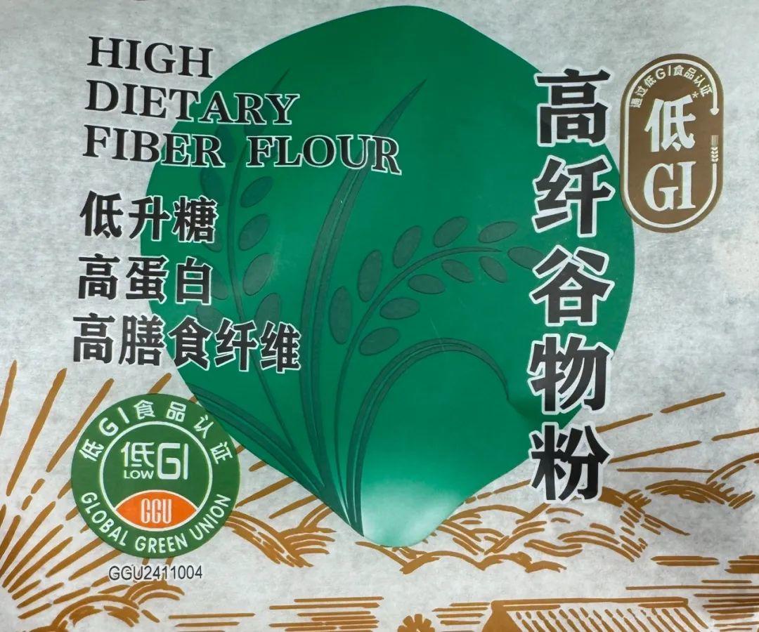 杂粮货架山,面粉包装上除了“低升糖、高蛋白、高膳食纤维”,也赫然印有“低 GI”的标签;