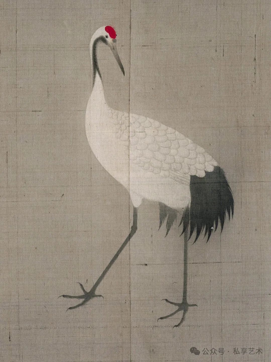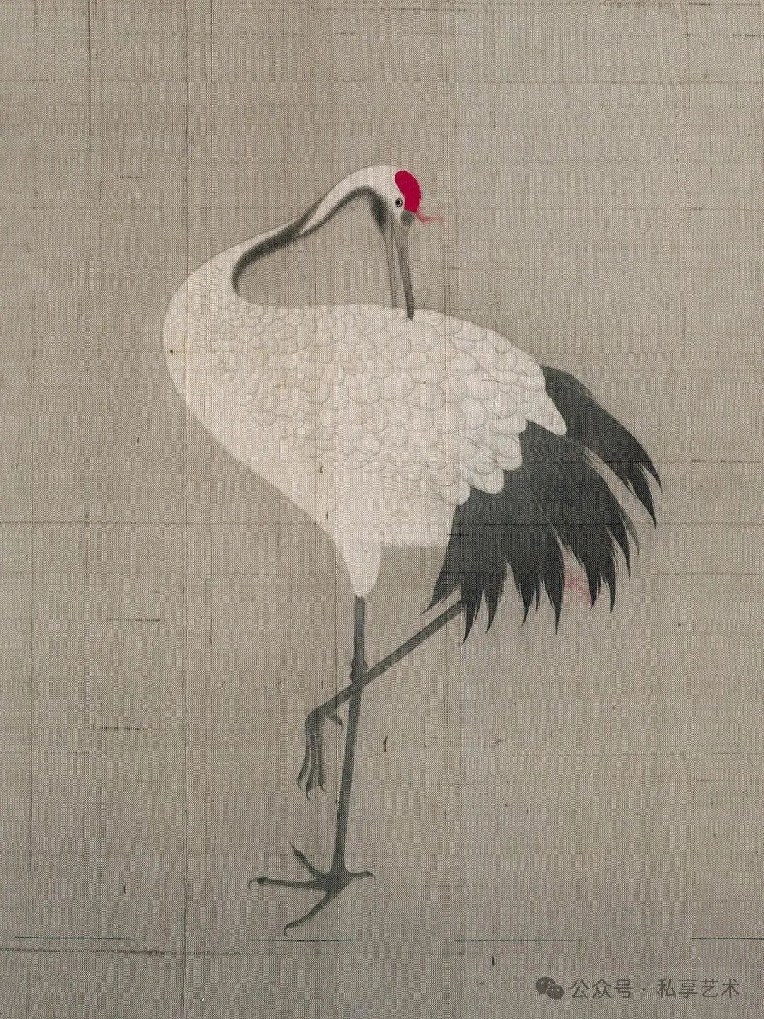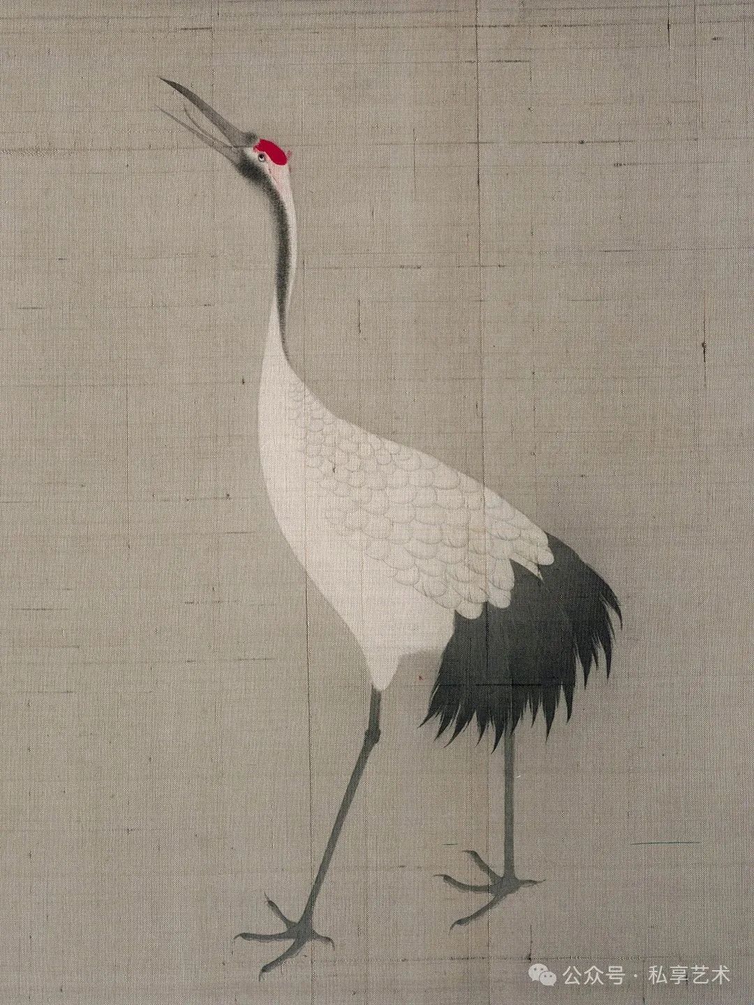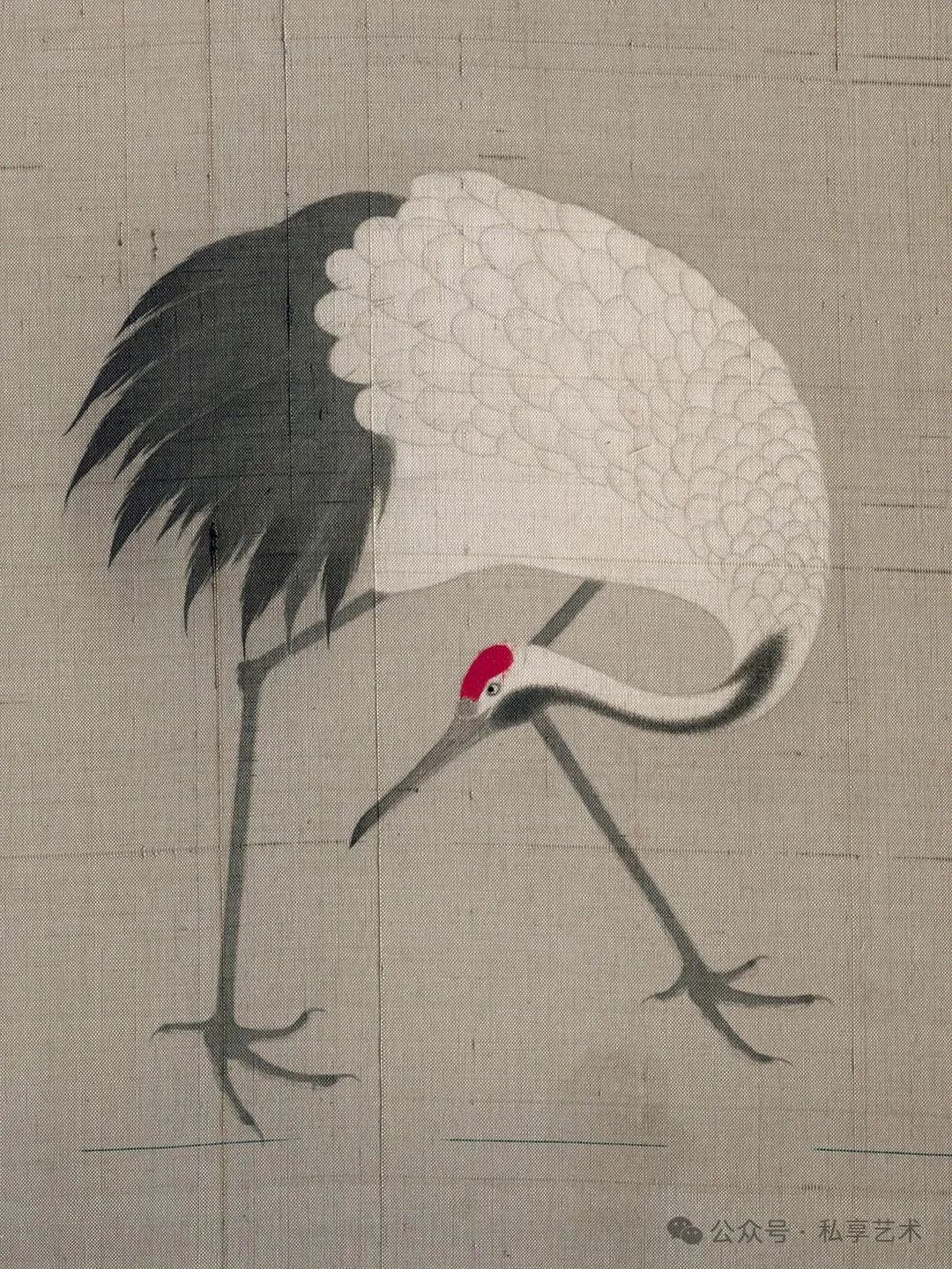 色彩铺陈,秉持极简之道。黑白灰三色纵横捭阖,交织出沉稳而灵动的色调。黑与白的对峙,如阴阳两极,在碰撞中生出张力;灰调则如暮霭轻烟,调和其间,使画面气韵和融。而仙鹤头顶那一抹艳红,如流星划破夜空,瞬间点亮视觉焦点,恰似禅宗顿悟之“机锋”,于极简中见出绚烂,在素朴里藏着神奇,暗合“一即一切,一切即一”的深邃哲思。