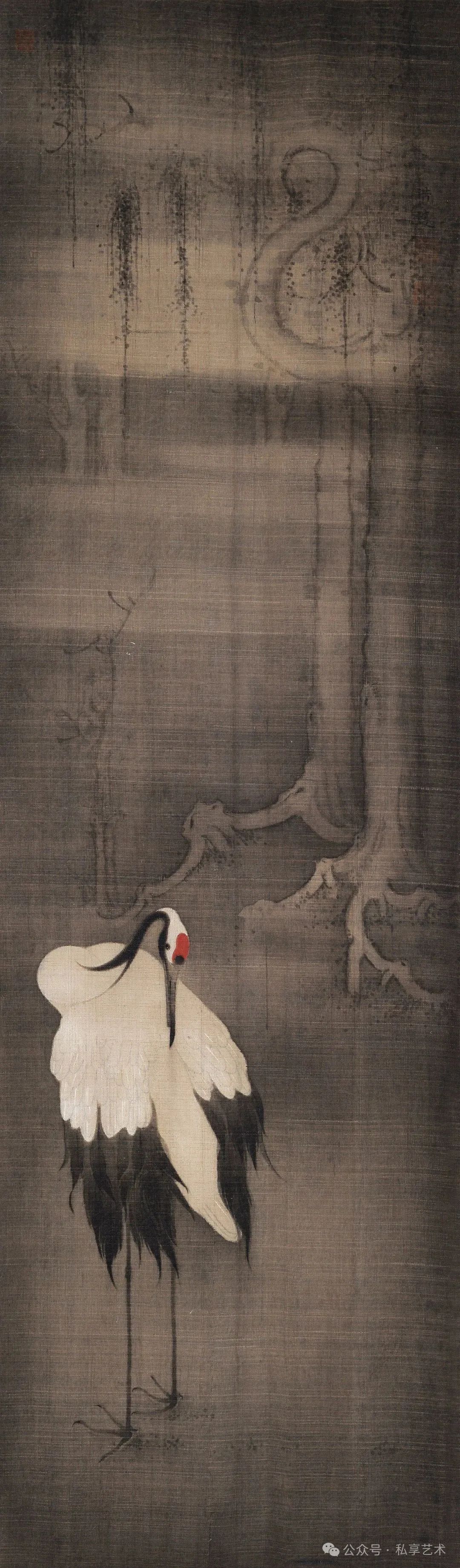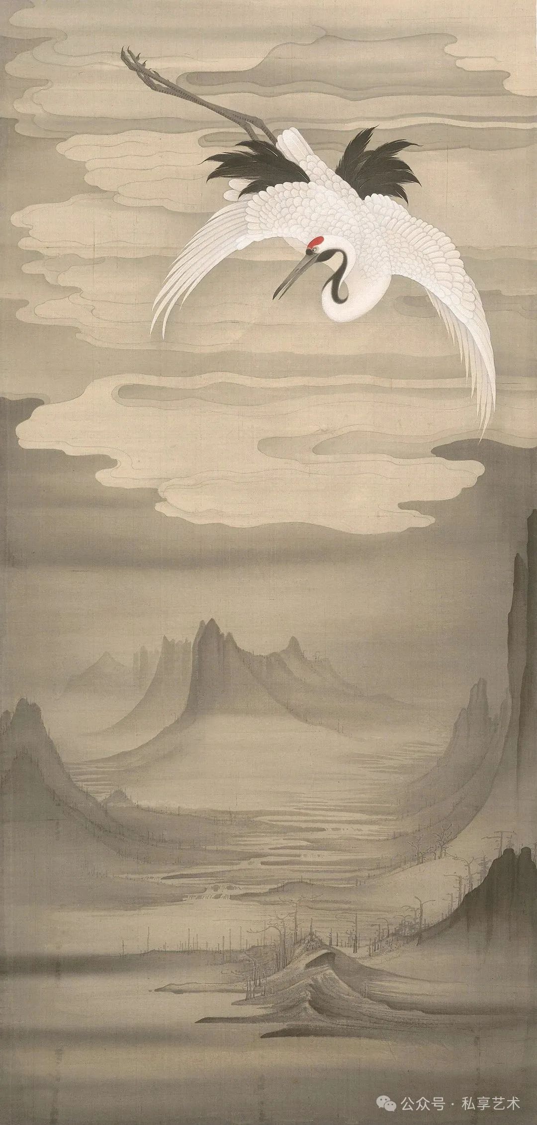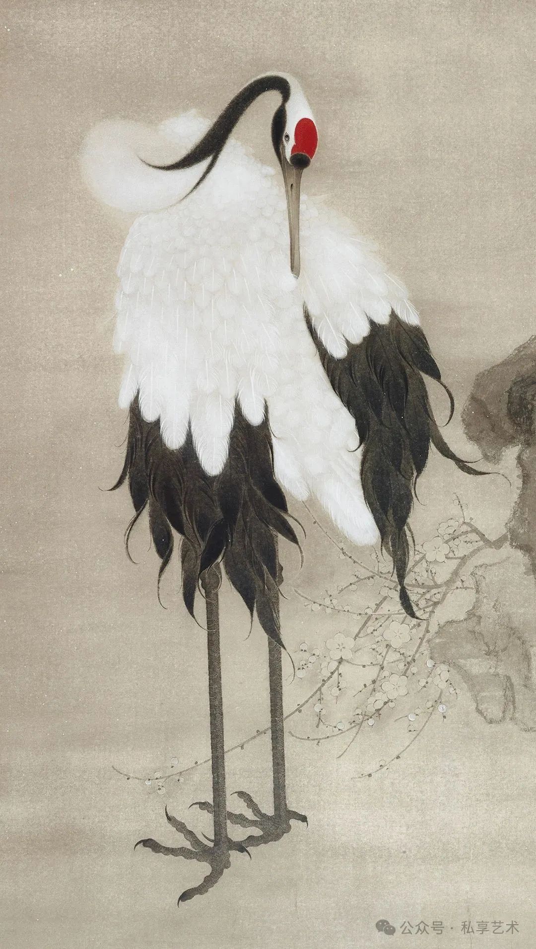 色彩铺陈,秉持极简之道。黑白灰三色纵横捭阖,交织出沉稳而灵动的色调。黑与白的对峙,如阴阳两极,在碰撞中生出张力;灰调则如暮霭轻烟,调和其间,使画面气韵和融。而仙鹤头顶那一抹艳红,如流星划破夜空,瞬间点亮视觉焦点,恰似禅宗顿悟之“机锋”,于极简中见出绚烂,在素朴里藏着神奇,暗合“一即一切,一切即一”的深邃哲思。