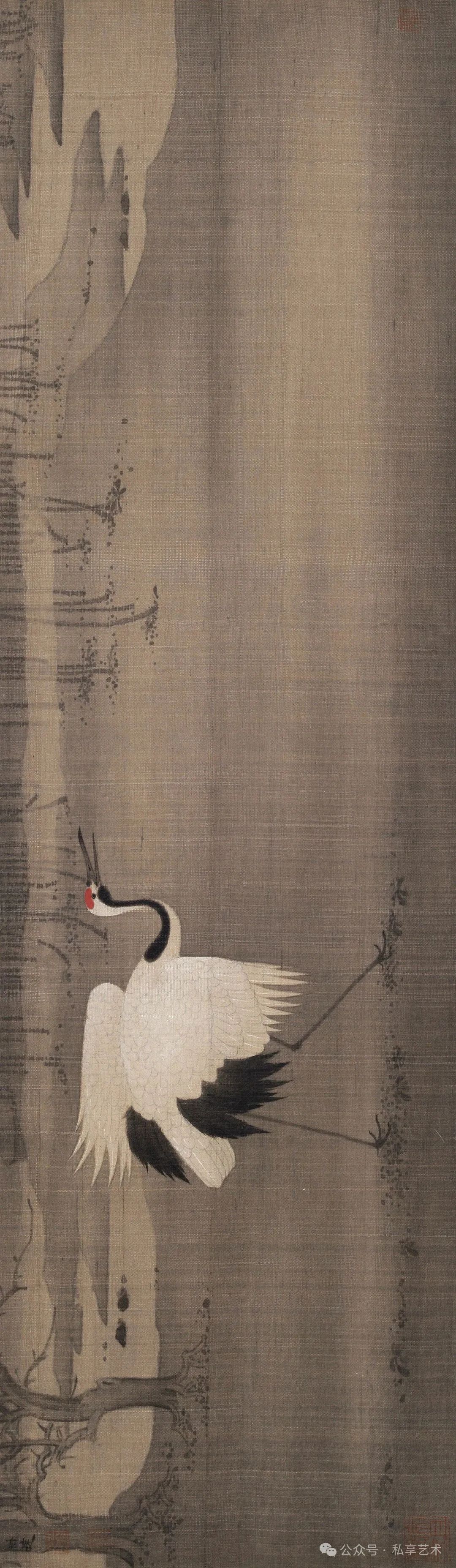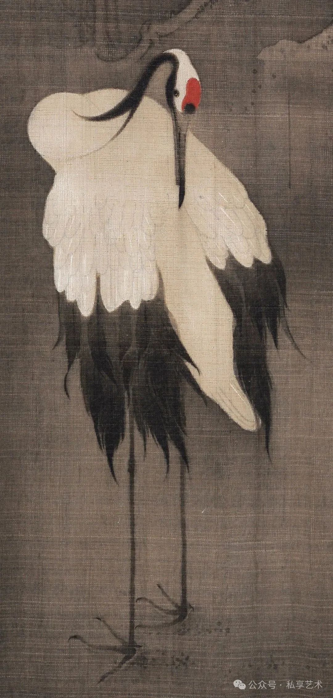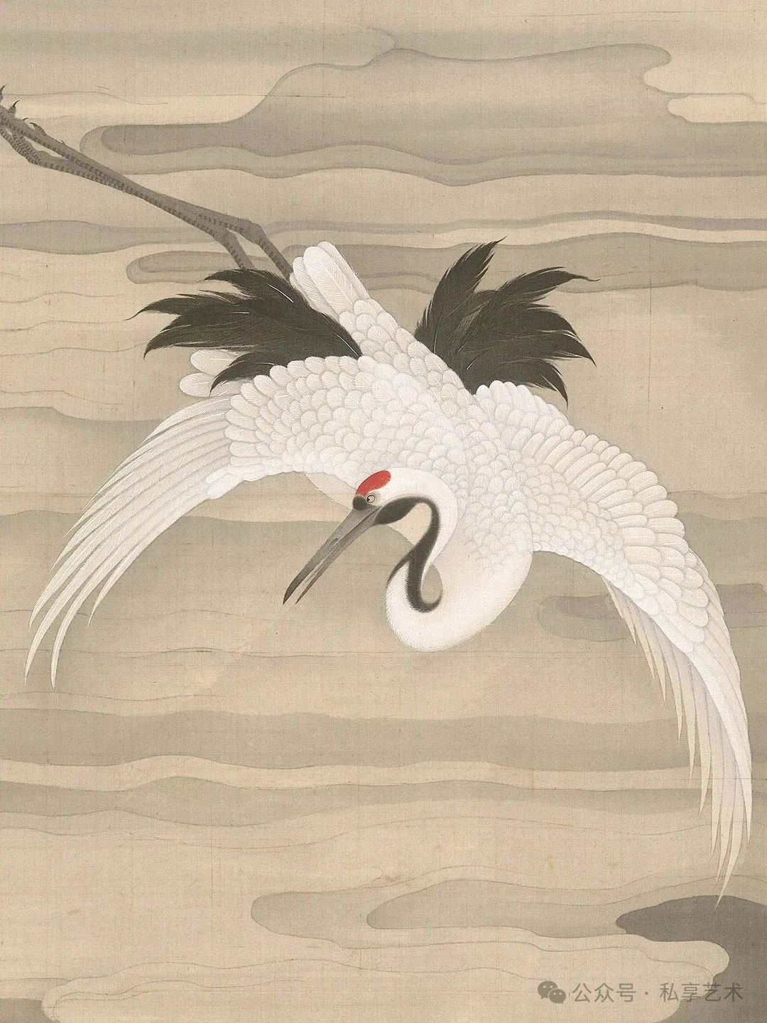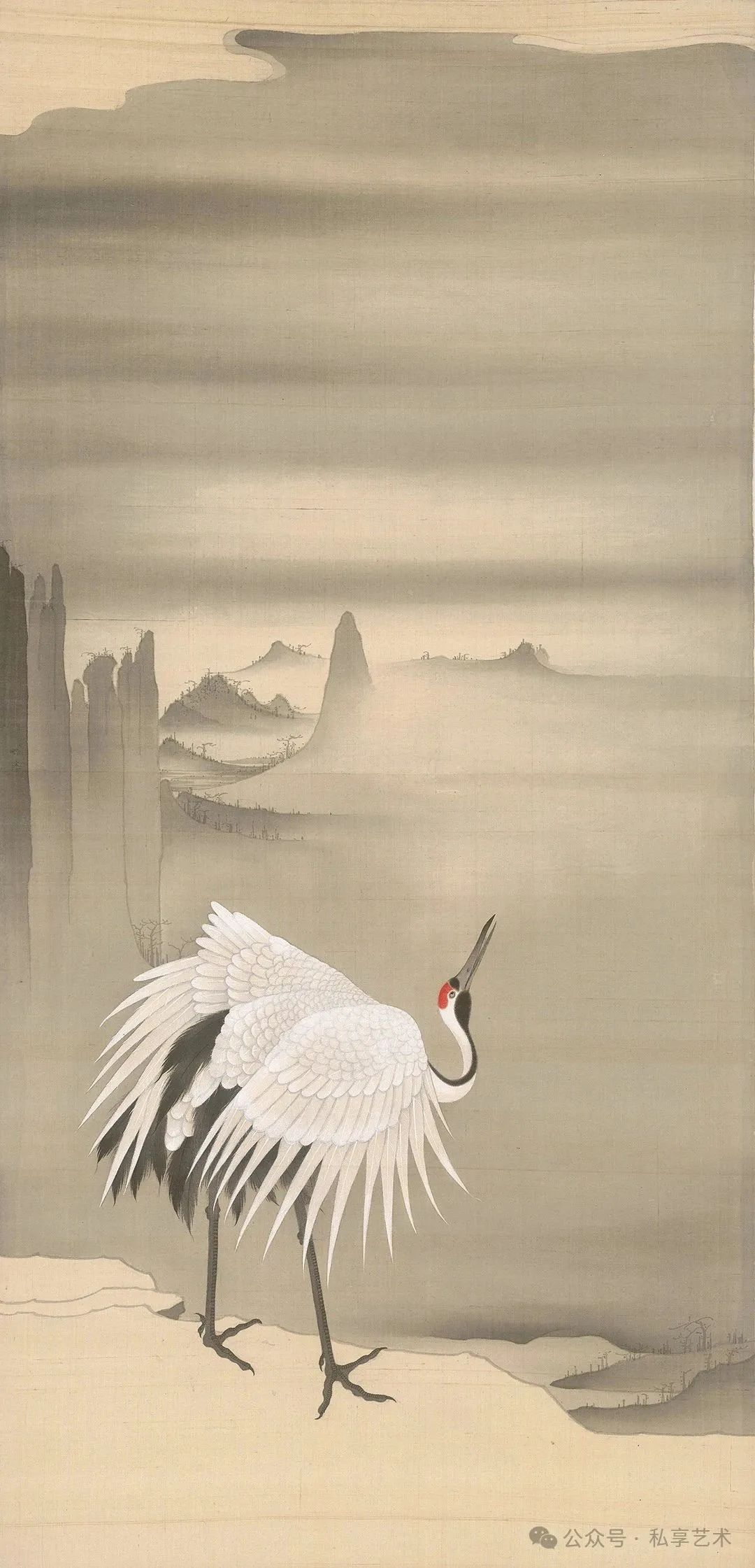 色彩铺陈,秉持极简之道。黑白灰三色纵横捭阖,交织出沉稳而灵动的色调。黑与白的对峙,如阴阳两极,在碰撞中生出张力;灰调则如暮霭轻烟,调和其间,使画面气韵和融。而仙鹤头顶那一抹艳红,如流星划破夜空,瞬间点亮视觉焦点,恰似禅宗顿悟之“机锋”,于极简中见出绚烂,在素朴里藏着神奇,暗合“一即一切,一切即一”的深邃哲思。