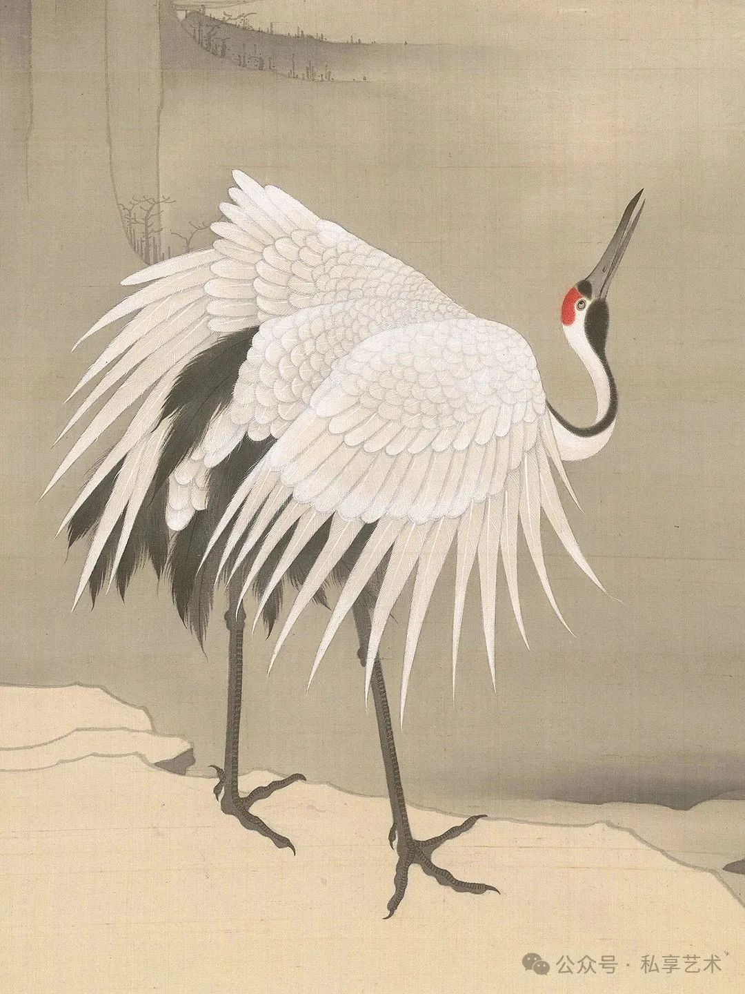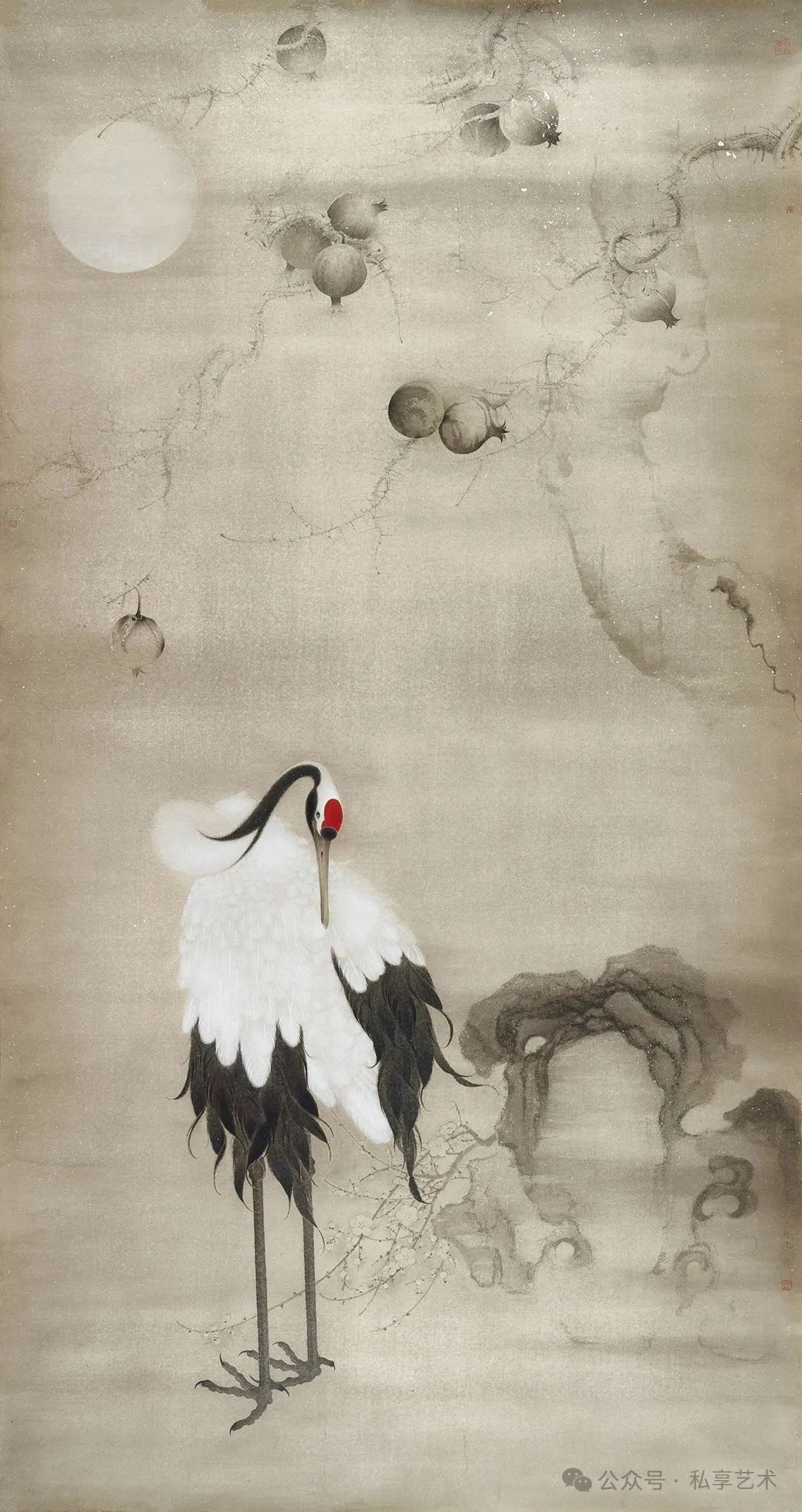 于构图一端,深谙东方美学“留白”之妙谛。画面常以单只仙鹤为枢,周遭大片留白,仿若鸿蒙初辟的太虚之境。背景或添山水微痕,或缀月色幽晖,皆以“不著一字,尽得风流”之态,让主体卓然而立。这留白并非虚空,而是容纳万象的无垠场域,是“空故了群色,清故纳万境”的生动演绎,于疏朗间见出深邃,在简净中藏着丰盈。