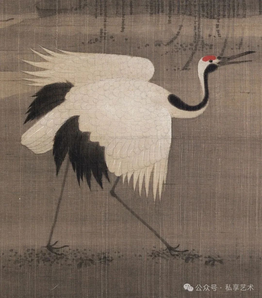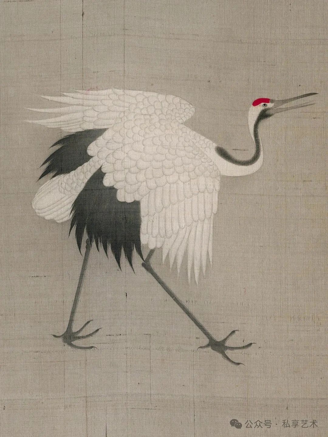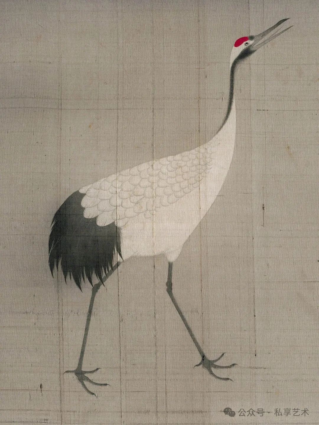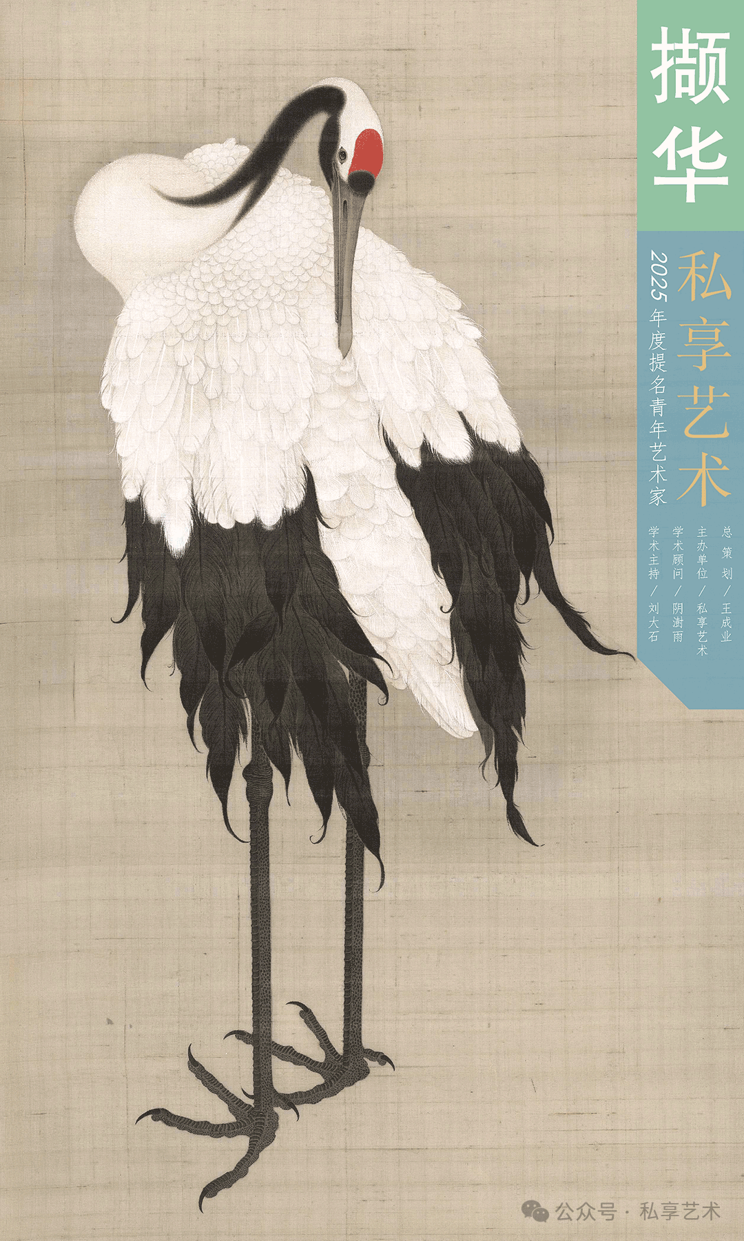 线条舞动,是造型的诗章。画家以灵动且富有节律的线条,编织仙鹤的形神。线条或疾或徐,或曲或直,似在与仙鹤的灵韵共舞。修长脖颈、亭亭玉腿、羽衣翩然,皆在这线条的流转中鲜活跃动。此线条之运用,暗合传统绘事之精要,却又自出机杼,在传承与创新间寻得微妙平衡,勾勒出的不仅是物象轮廓,更是仙鹤的清逸风骨。