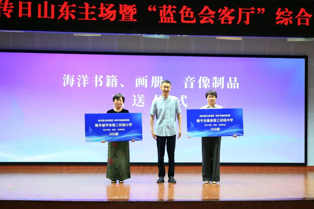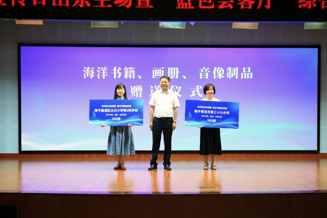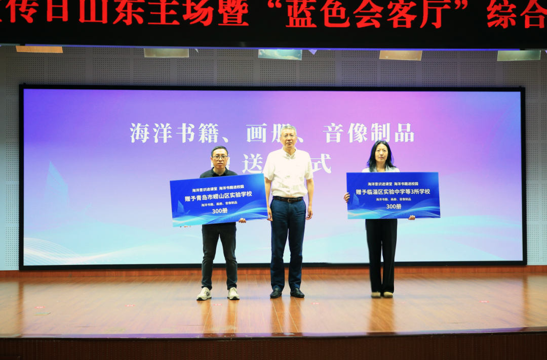 活动现场,分别向山东省中小学生海洋意识和素养展示活动小学组、初中组省级冠、亚、季军学校代表赠送了海洋科普书籍、画册和音像制品,鼓励更多中小学生亲近海洋、探索海洋,期盼在孩子们心中播下一颗知海、亲海、爱海的种子。