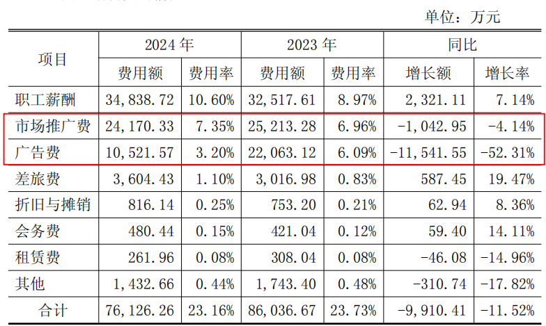 近年来香飘飘在营销方面投入较多,2024年销售费用为7.6亿元,其中市场推广费和广告费3.47亿,2023年更是高达4.73亿。