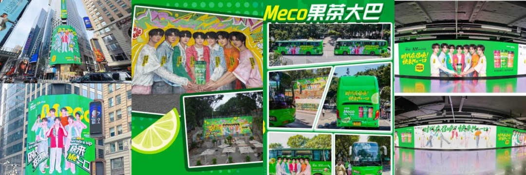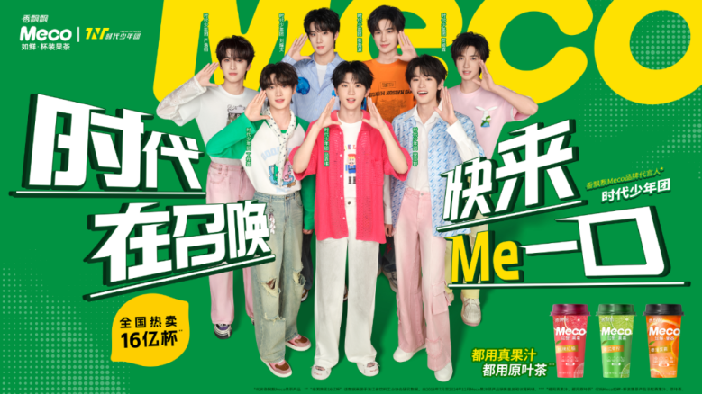 在品牌代言人方面,Meco果汁茶经历了多轮换代,从最初的陈伟霆、蔡徐坤,到时代少年团,可谓一直只选顶流。
