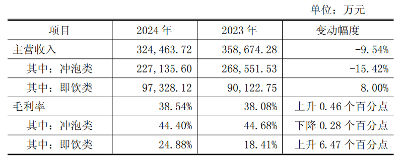 (香飘飘2024年度主营收入及毛利率情况,图源香飘飘2024财报)