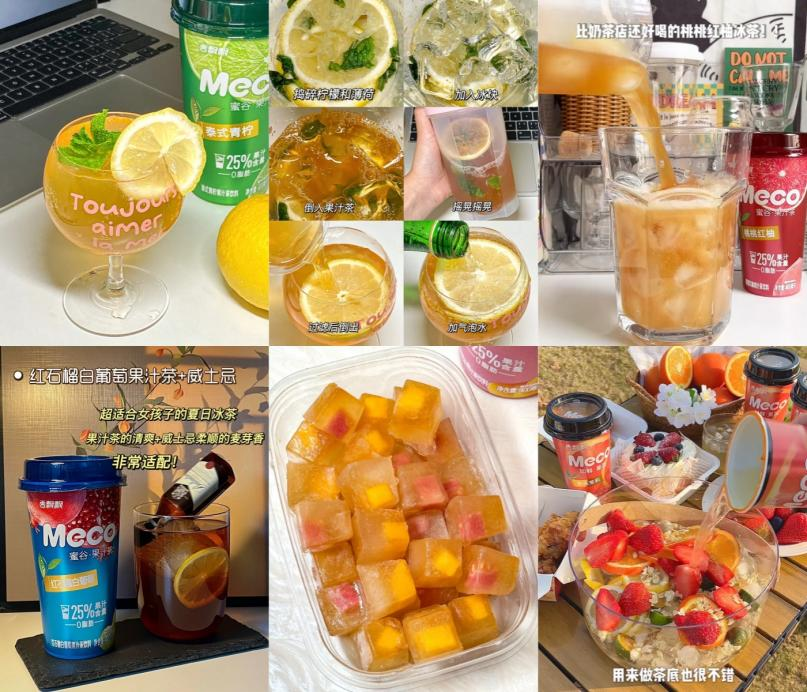 同时,大量网友在小红书、抖音上对Meco果茶展开创意搭配,自制果茶特调教程及隐藏喝法等内容涌现,相关笔记动辄上千赞。