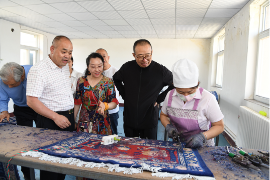 2025年5月,在宁夏中卫市滩羊地毯有限公司现场考察手工织毯技艺