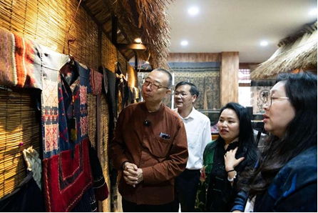 3月28日,在贵州凯里启风蜡染厂,调研民族服饰展示馆与染坊,与蜡染传承人兰启凤交流蜡染技艺传承与发展情况。