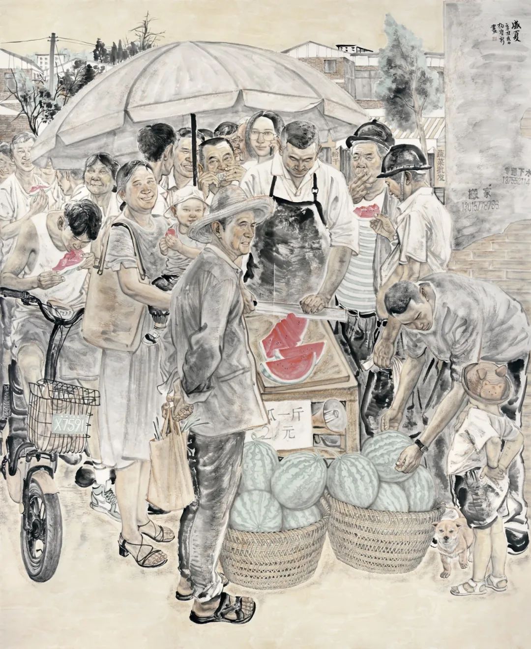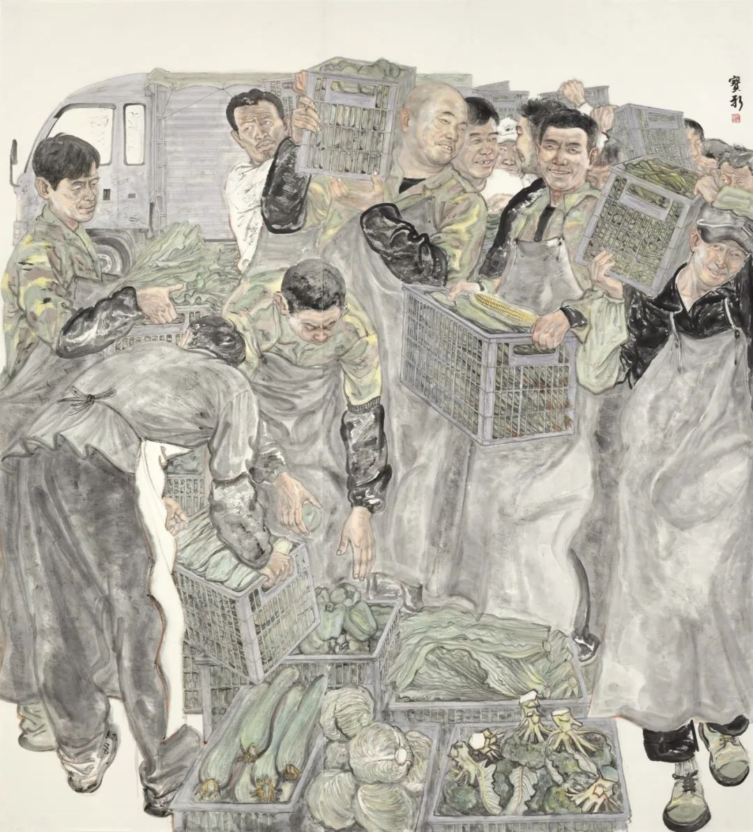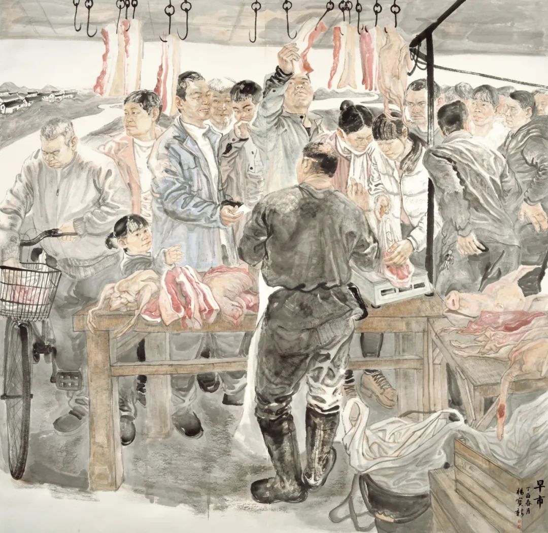 本科四年级时,杨宝新一头扎进了学校附近的菜市场,画了大量的速写,积累了相当多的创作素材,并最终完成了以反映菜市场为主题的毕业创作。作品立意鲜明,布局别致,造型严谨,笔墨轻松,生动鲜活的人物塑造,以及鸡鸭鱼肉和鲜果蔬菜的质感表现,充分展现出其创作的成熟和实力。这幅反映现实普通百姓生活,很接地气的作品,在毕业展览中脱颖而出,获得一致好评。之后,杨宝新越发痴迷于对菜市场的系列创作的热情,坚定而有效地将这一题材向纵深延展。研究生期间又潜心创作了多幅,其中一幅成功入选第十三届全国美展,并被福建美术馆收藏。借此,他也成为了福建画坛中国人物画的后起之秀。