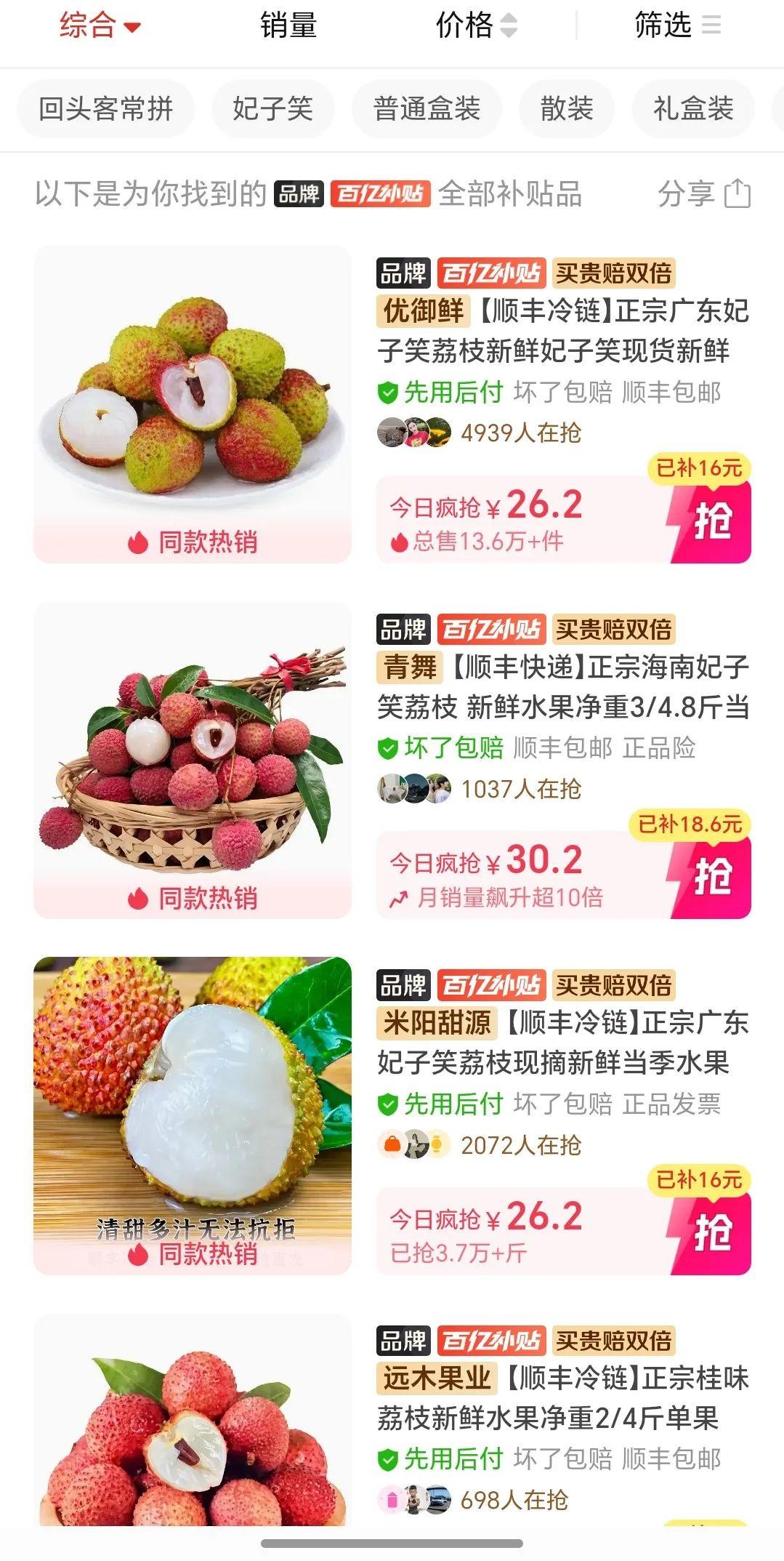 保鲜只是最基础的要求。眼下,单果重量低于18克的妃子笑,已经无法在拼多多百亿补贴专区销售,只会被贴上“次级果”的标签。再辅以严格的分拣,避免藏在泡沫箱深处的以次充好。