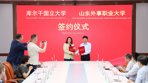 在与会嘉宾的共同见证下,刘先义与娜婕日塔分别代表山东外事职业大学与俄罗斯库尔干国立大学签署校际合作备忘录。根据协议,双方将本着“互惠互利、资源共享”的原则,围绕师生交流、学术合作、教学资源共享等方面深入开展多层次、宽领域的务实合作。