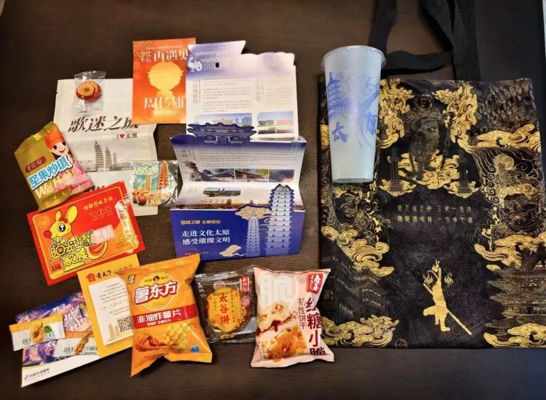除了吃的,很多歌迷的伴手礼还有冰箱贴、城市旅游地图等各种太原周边,还有小扇子、防晒帽、冰袖、《黑神话:悟空》手提袋等等,就连暖宝宝、漱口水都出现在了伴手礼的行列。