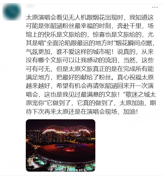鉴于此,歌迷对本场太原演唱会好评如潮,太原文旅至此仿佛打开了任督二脉,各种花样惊喜让大量歌迷愿意奔赴太原。