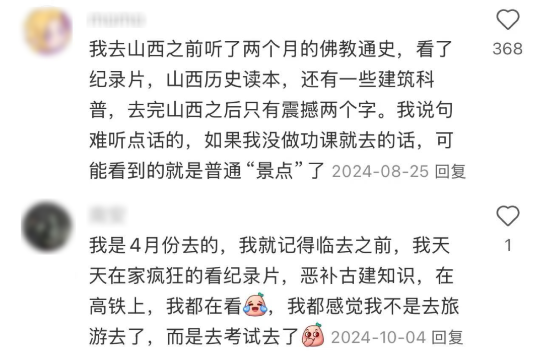 为了更好地感受山西古建筑的文化,甚至有网友来之前狠狠恶补古建知识,感慨自己“感觉不是去旅游,而是去考试了”。