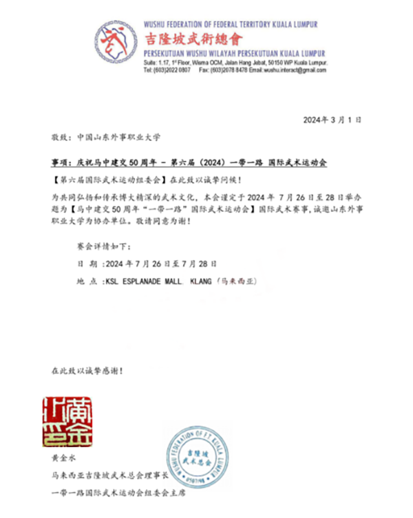 近日,马来西亚吉隆坡武术总会发来邀请函,诚邀山东外事职业大学协办“庆祝马中建交50周年——第六届(2024)一带一路国际武术运动会”国际武术赛事,这一重要赛事计划于2024年7月26日至28日举办。