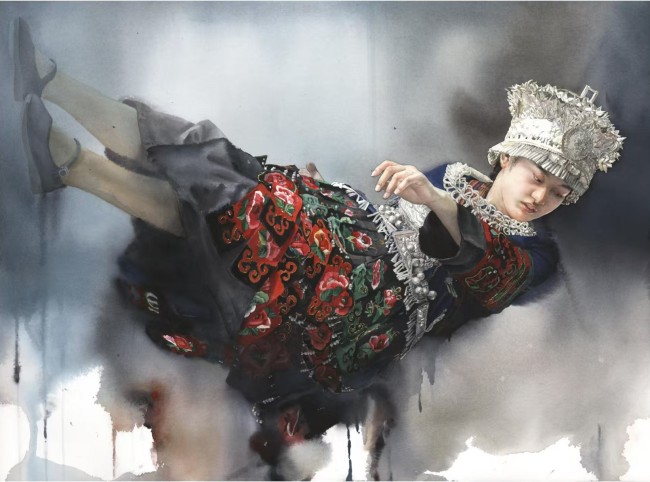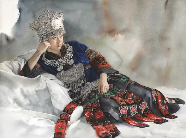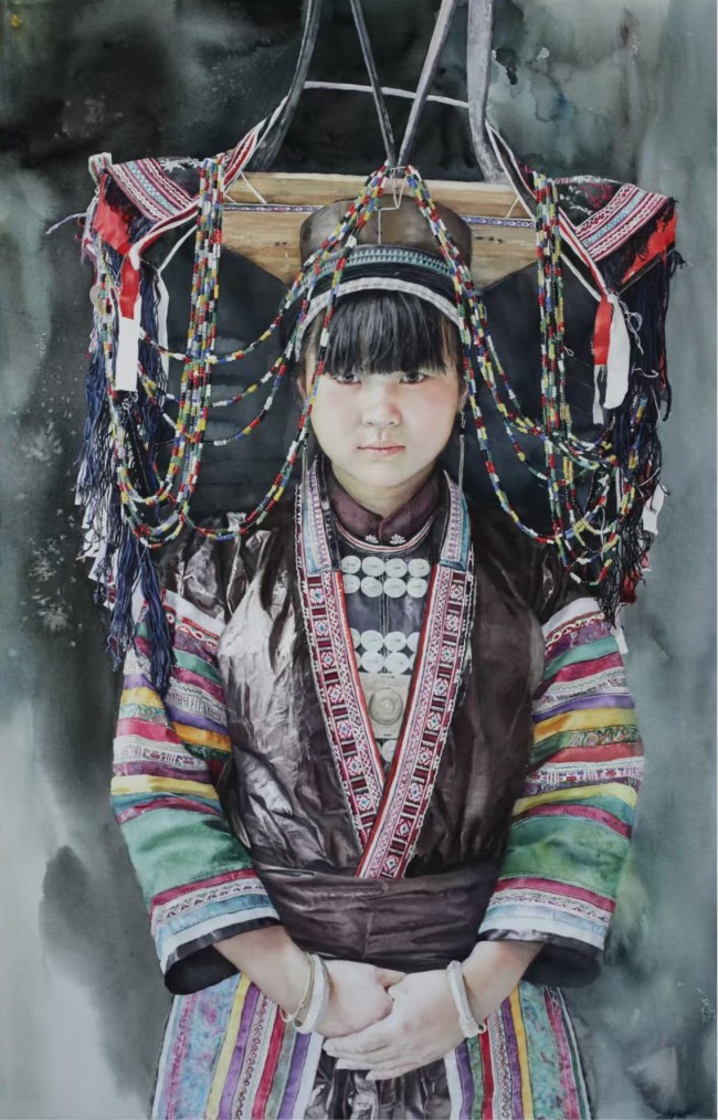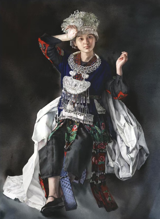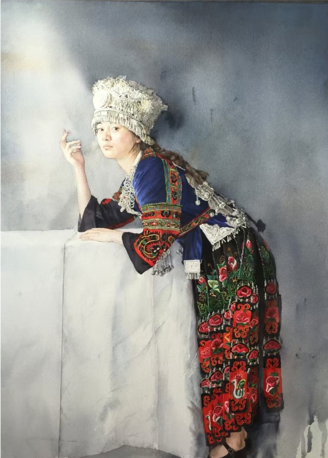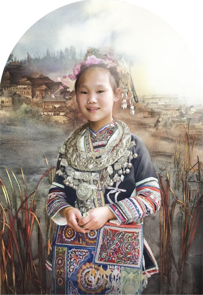 她的民族题材创作并非“风情化”处理,而是扎根于真实生活的深入描绘。她以女性特有的细腻视角,关注人物的日常与精神状态。在《瑶族女孩》中,她将水墨的写意与水彩的肌理相融合,描绘出梦幻与现实交织的氛围,使人物神韵、个性跃然纸上,展现出少数民族文化的丰富与生动。