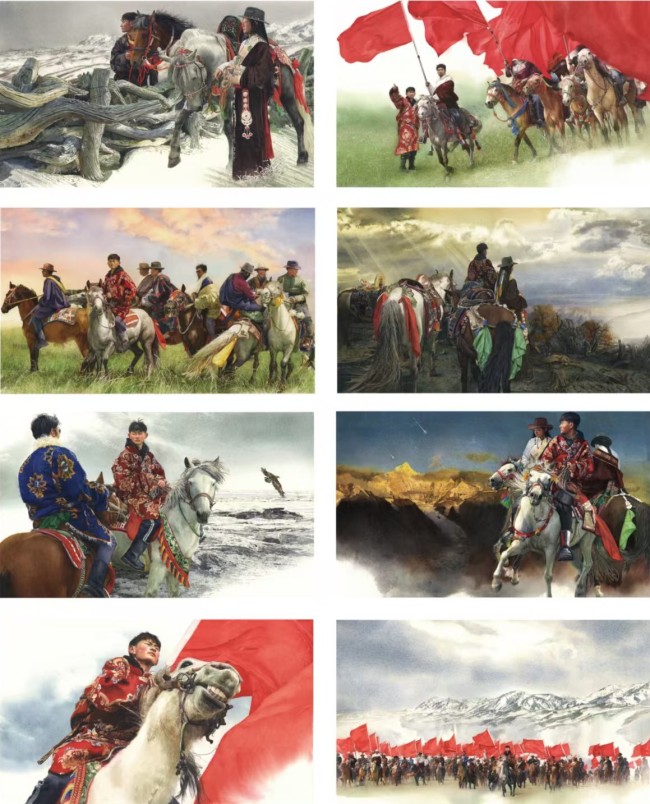 近年来,沈璐将创作视野拓展至少数民族题材,呈现出令人瞩目的突破。连环画作品《旌旗》以藏族少年为主角,描绘草原上的赛马场景与红旗飘扬下的民族团结。为捕捉真实生活细节,她深入青藏高原采风,记录天光流转、马蹄飞扬与人物神情。她对红旗光感、水彩晕染与高原氛围的精准把控,使画面充满动势与情感张力。