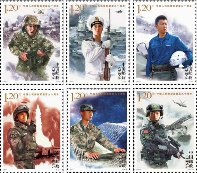 《中国解放军建军九十周年》,纪念邮票设计,40×50cm6幅+小型张1幅