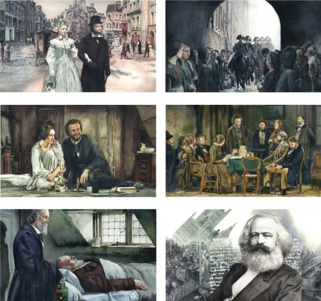 与此同时,她善于借用“电影镜头”式的构图语言,推动画面节奏,强化视觉冲击与叙事力量。这一风格也在她创作的连环画《马克思》中得以体现,使传统题材焕发出当代气质,为连环画注入更强的叙事张力和视觉感染力。