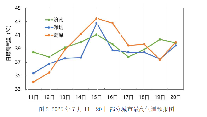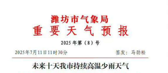 预计7月11-20日,受副热带高压和大陆暖高压影响,我市高温少雨天气仍将持续,11-13日,全市最高气温36~38℃局部40℃以上;14-15日为高温热浪最强阶段,最高气温38-40℃,局部 42℃以上;16-20日,最高气温35~37℃,局部 39℃以上。