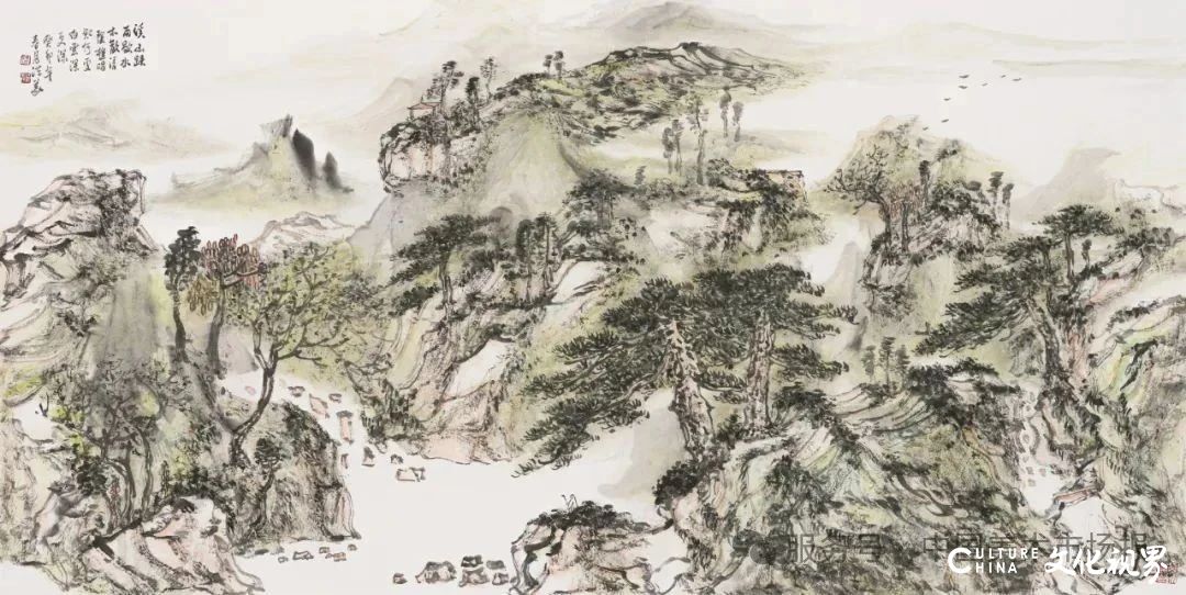 观其山水画,既能见北国山川的雄浑壮阔,层峦叠嶂间墨色苍劲,笔力千钧,仿佛能听见峰峦间的风涛之声;亦能绘江南水乡的灵秀温婉,浅绛淡彩中透着氤氲水汽,笔触细腻处尽显江南的烟雨朦胧。他不囿于传统山水的程式化表达,而是将对自然的体悟与个人的情感融入笔端,使每一幅作品都充满生命力。其构图开合有度,或咫尺之间见千里之势,或局部特写显精微之妙,墨色的浓淡干湿、线条的刚柔缓急,皆服务于意境的营造,于“能品”的技法娴熟之上,更臻“妙品”的意趣盎然。