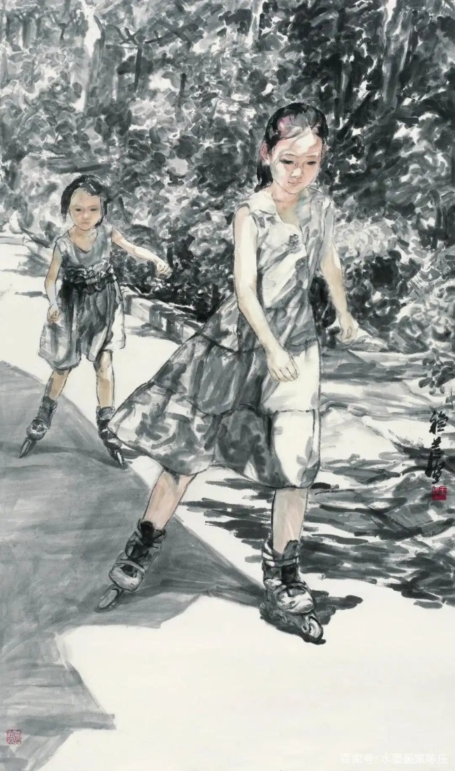 在形式探索方面,王稳苓构建了一套极具个人特色的艺术语法。在她的手中,水墨不再仅仅是勾勒轮廓的工具,而是成为了情感流动的直接载体。她善于利用水墨的渗透性与不确定性来表现那些难以言说的心理状态,使画面的物质材料与精神内容达到了高度统一。在构图上,王稳苓常常打破常规的视觉逻辑,创造出一种诗意的空间关系——人物与环境不是主客对立的关系,而是相互渗透、相互映照的有机整体。色彩运用上,王稳苓既不拘泥于传统水墨的黑白灰体系,也不盲目追随西方绘画的色彩系统,她的色彩总是恰到好处地饱和,既足够强烈以传达情感强度,又足够含蓄以避免感官刺激。