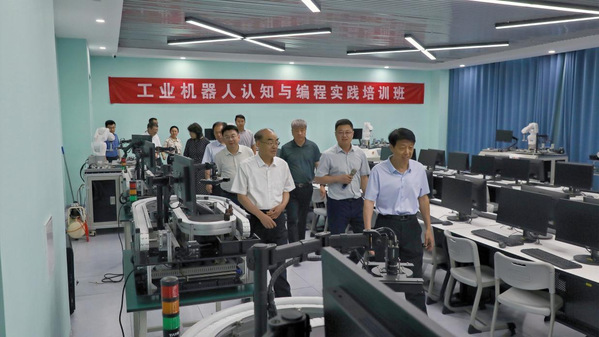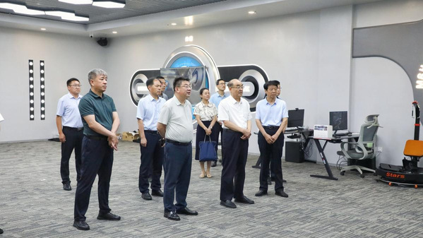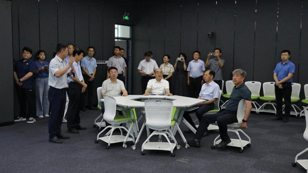 调研期间,刘贵堂一行参观了学校元宇宙研究院、全景教学空间、虚拟现实技术实训室、智慧教室等创新教学场所,详细了解学校在教育数字化和国际化教学模式创新方面的举措,并观看了虚拟仿真教学展示。