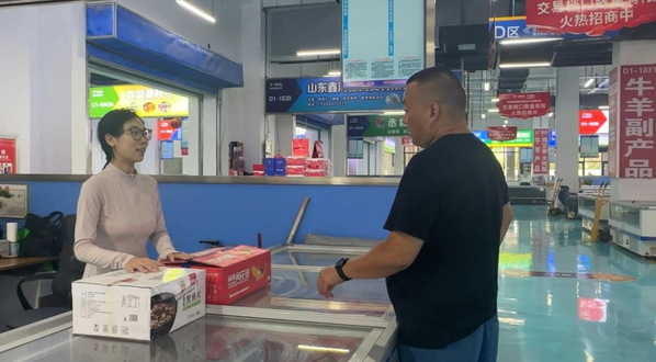7月19日,泉城破晓队迎来第七天的挑战。朱高洁、王楠、谢雯雯在冷库工作,一边销售一边搬运货物。冷库温度低,环境艰苦,但她们没退缩:朱高洁热情介绍产品吸引顾客,王楠、谢雯雯专注搬运,累了就聊趣事放松。
