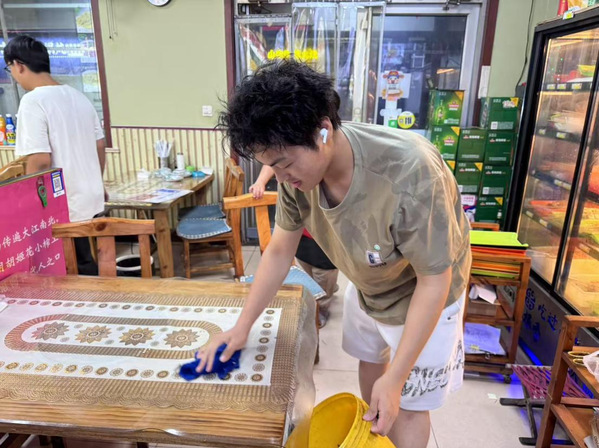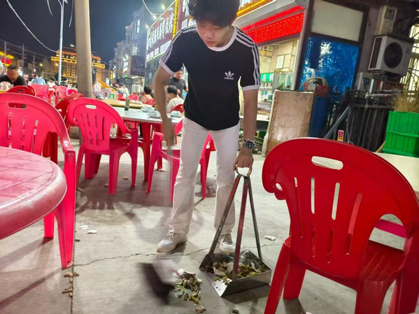 一名队员手持扫帚清理食客留下的垃圾,油污溅到裤脚也不在意,连角落碎屑都不放过;另一名队员负责擦桌子,从起初手忙脚乱到后来高效配合摊主翻台,还总结出“先湿擦去油、再干擦去水”的技巧。