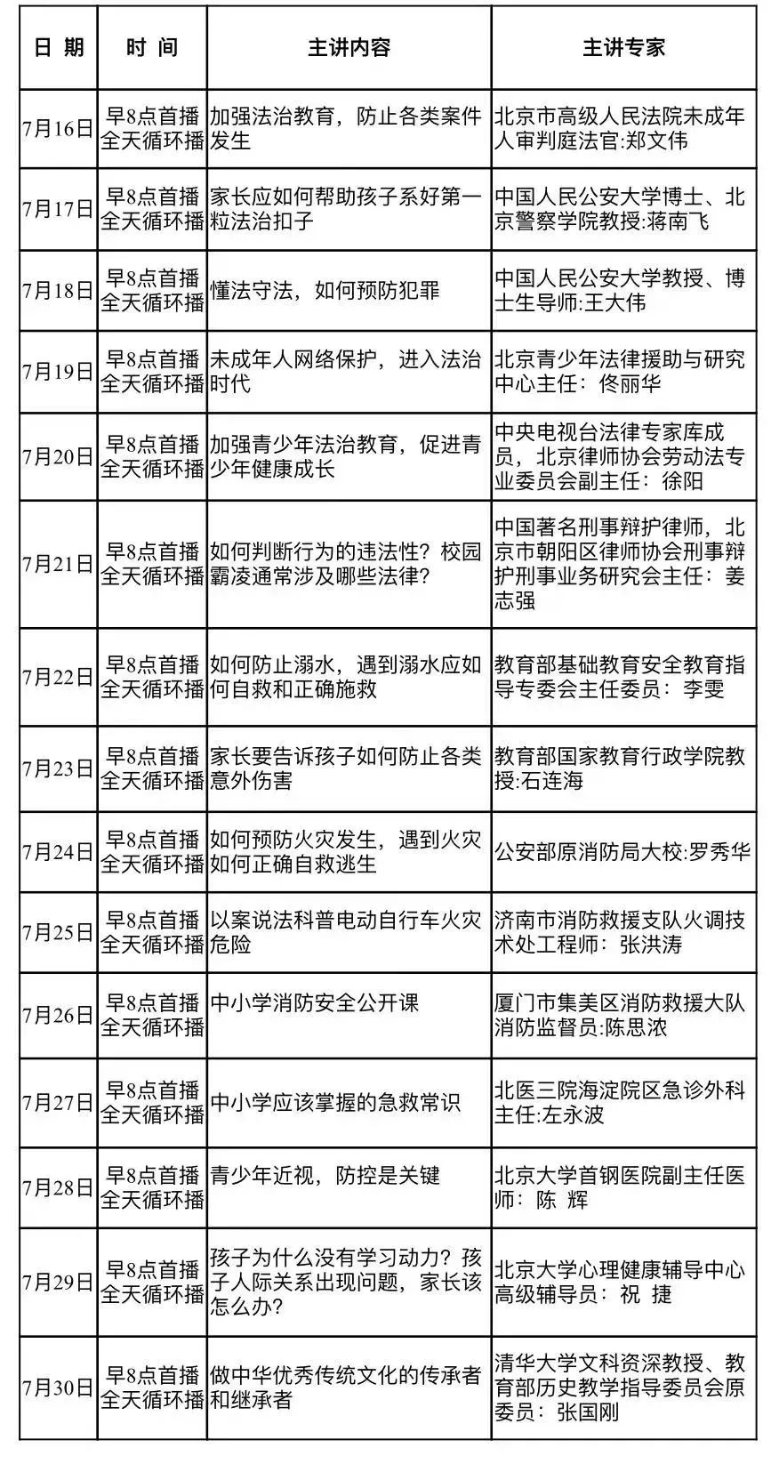 2025年7月16日至7月30日,通过中国教育网络电视台新媒体号连续播出15天,每天1讲,早8点首播,24小时循环播出。