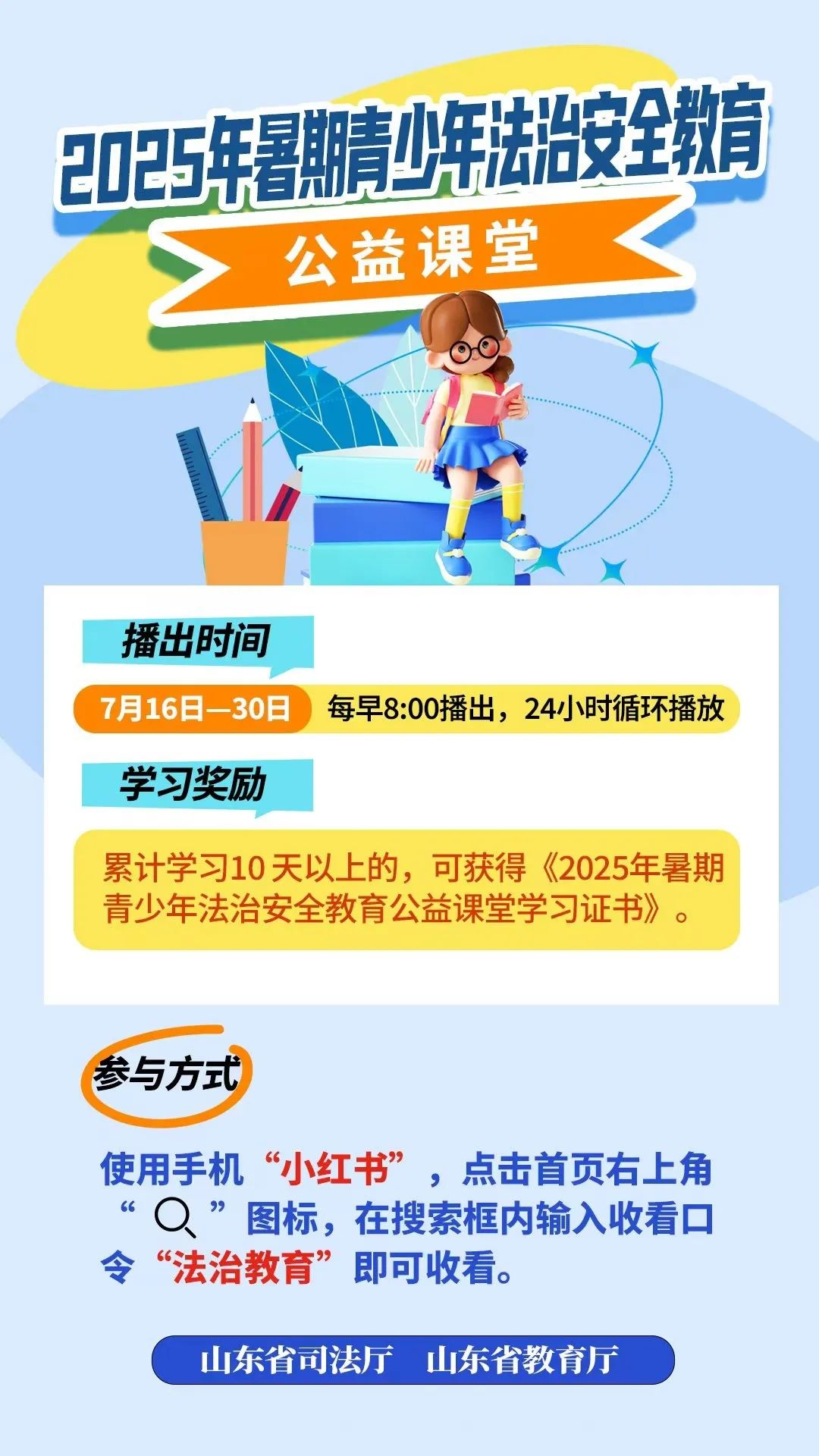 为深入推动全省“八五”普法规划实施,着力推进校园法治文化建设,切实加强暑期青少年法治安全教育,山东省司法厅、省教育厅面向全省大中小学学生及家长,组织开展2025年暑期青少年法治安全教育公益课展播活动。