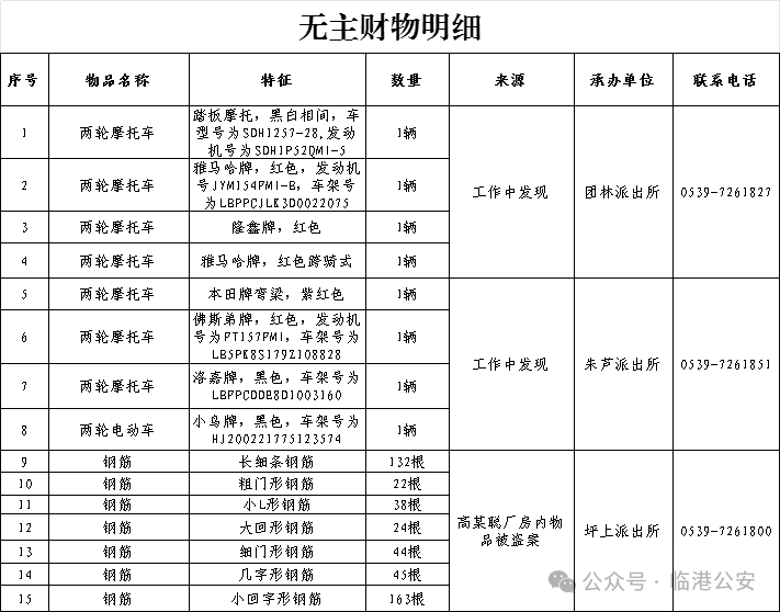 临沂市公安局临港经济开发区分局关于认领无主财物的公告