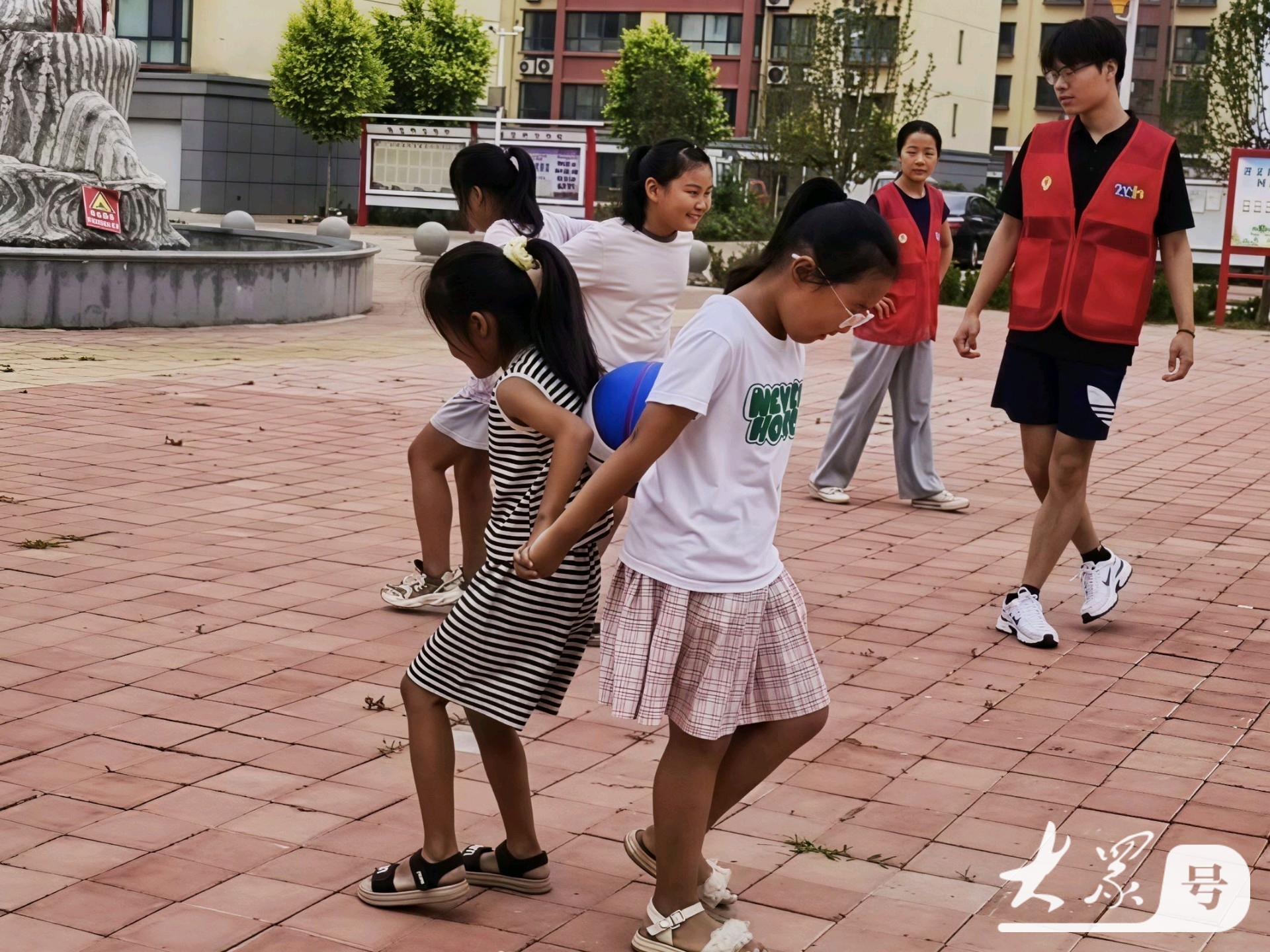 图为小朋友背对背夹球跑。吴威廷 供图