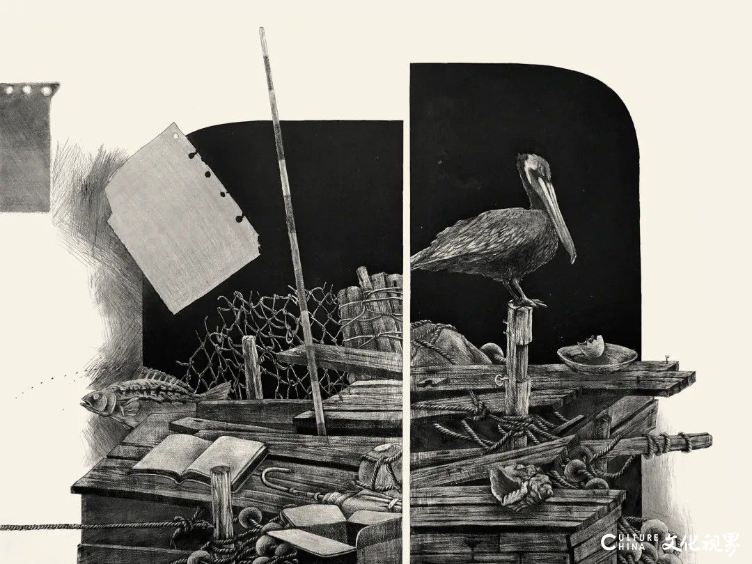 在青岛画院的集体创作环境中,杨越进一步深化了对传统文脉的现代性转译。他创作的《漂浮》(2011)、《漂浮2》(2015,见封面)、《叙述》(2014)、《叙事》(2015)等版画作品,将渔港常见的缆桩、缆绳、船体、贝壳、鱼类等物象从现实语境中抽离,通过多层蚀刻形成的空间叠压,使日常劳动工具升华为承载集体记忆的文化符号。这种“在地性”表达并非简单地再现地域风貌,而是以胶东渔村为精神原乡,在画面中构建起时空交错的象征体系:绳索既是对渔民劳作场景的客观记录,其缠绕形态又暗合了中国传统绘画的线性美学;而漂浮的海螺壳在美柔汀技法的细腻灰调中,既指向海洋生物的自然属性,又化作储存文化记忆的螺旋载体。