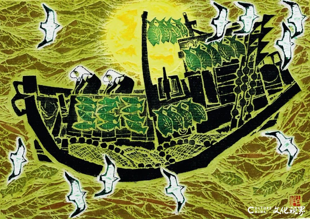 陈国贵、张白波、杨越的作品,均体现出对传统线刻美学的传承与发展。他们的艺术实践不仅延续了中国版画的民族化探索,更赋予传统技法新的时代内涵。在地域文化表达上,青岛画院的版画家们以胶东半岛的渔村生活、海洋景观为创作母题,将地域符号升华为艺术语言。陈国贵的“青岛系列”作品以细腻的刀法刻画城市风貌,张白波的渔港题材作品通过实物拓印再现海洋气息,杨越则通过船体、缆绳等意象构建渔村记忆的象征体系。这些作品不仅是对地域风貌的再现,更是对青岛海洋文化的深度诠释,展现了艺术与地域的紧密联系。