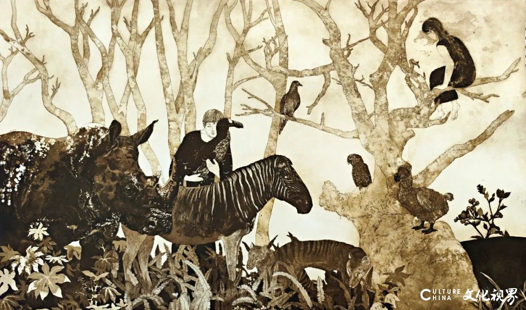 杨媛媛的版画创作以铜版为主,其作品表现了童话一般梦幻的景象。女性特有的敏感、直觉力和细腻的手法在她的作品中展现得淋漓尽致。她的《罗马寓言故事》(2016),并非对古典神话的简单再现,而是以童话般的视角重新诠释,赋予古老传说以迷离的梦幻滤镜,观者仿若在庄重与奇幻间游走。《十一支歌谣——叶》(2017)则如一首可视化的古老民谣,叶片仿佛承载着失落的旋律与隐秘的传说,在画面中低吟浅唱。2018年,她以《青春的纪念》和《青春的标本》两组作品,探讨了时光流转与记忆的永恒性。近年来,杨媛媛的创作目光似乎更多地投向了时间消逝的主题,这在她2023年的两幅力作《即将远去的风景》与《已然远去的风景》中表现得尤为突出。这两幅作品如同时间轴上的两个连续切片。前者弥漫着一种临界的张力,描绘的是尚在眼前却预感其即将消隐的景象,充满了挽歌般的眷恋与对未知的凝视;后者则定格了消逝之后的静默,曾经的风景已化为记忆中的碎片或某种精神的象征,画面中沉淀着深沉的哲思与永恒的宁静。这两幅风景,超越了物理空间,更像是心灵图景的变迁,其奇幻的神秘色彩并非来自具体的神怪,而是源于对“存在”与“逝去”这一对永恒命题的超现实表达。