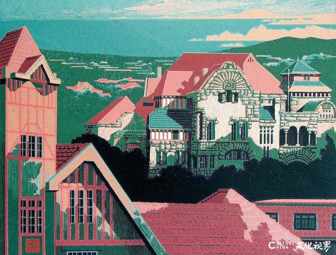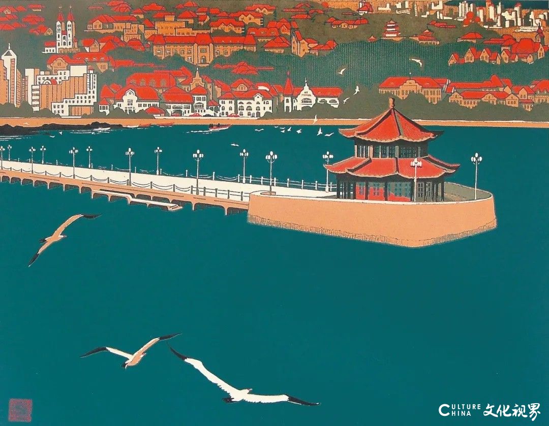 陈国贵于20世纪60年代毕业于浙江美术学院(现中国美术学院),接受了严格的专业美术教育,奠定了扎实的造型基础。他在版画创作中,以线条作为形式构成的主元素,将重叠的形象、散点的透视结合起来构成多维视觉效应,并融进了在线的流动中产生的韵律和刀痕疾、徐、滞、涩带来的特有力度,开辟了一个纯真的意象造型世界。陈国贵的代表作品有《腊月》(1986)、《风味》(1990)、《桥》(1991)、《长城》(1991—1992)、《绣球》(1992)、《秋》(1998)和“青岛系列”(1996)等,其“青岛系列”之《海上奇峰》《瞰景聆涛》《车站初日》《夕阳钟声》《石楼曲径》等,刀法细腻,色调雅致,画面浑朴而不失隽永清俊,是反映青岛城市人情风俗和自然景观的佳作,可以说开创了岛城视觉叙事的新范式,其刀刻线条既是渔网交织的视觉符号,又是潮汐律动的抽象表达,刀痕的疏密节奏暗合海洋文化的呼吸韵律。《腊月》《风味》分别以胶东地区的剪纸窗花和白菜、大葱为原型,通过木刻与拼贴的跨界实验,将胶东人民的生活场景转化为具有金石质感的当代艺术文本,彰显出“在地性”文化转译的典范价值。