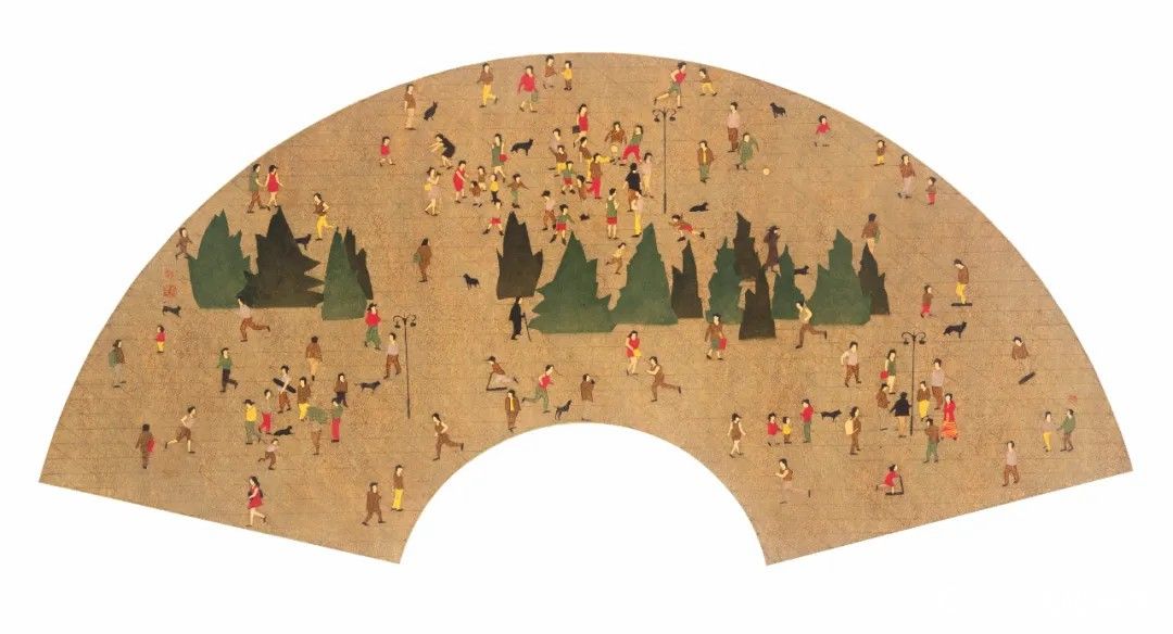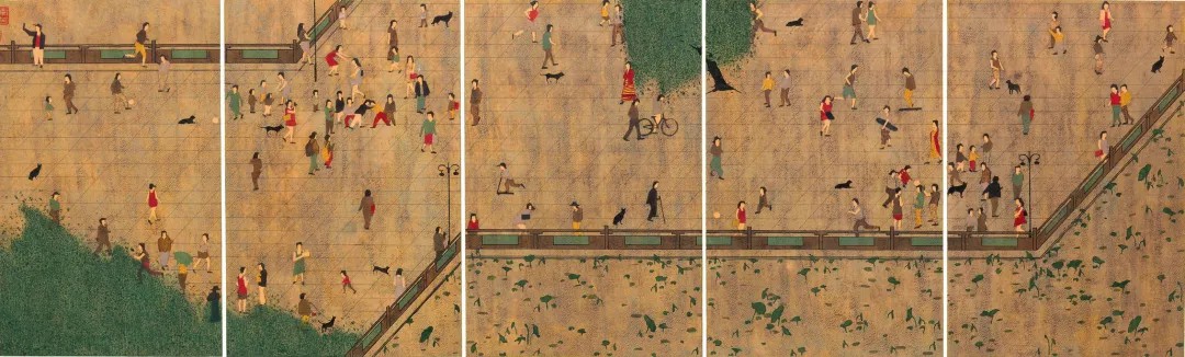 李芳毕业于青岛大学美术学院,以综合版画为主要创作方式。其代表作“夏有凉风”系列从传统绘画着手,以宋元时期绢本绘画的底色与画面整体品相为基础,采用脱胶版画创作手法,将传统与当代进行嫁接。他以《清明上河图》所描绘的宋代汴梁的市井风貌为切入点,将古代绘画的生活风貌转化为对现代生活状态的呈现,将都市绿地公园里人们休闲生活的场景搬进画面,展现出改革开放以来广场空间功能性的变化,昭示着新时代新生活的美好前景。李芳也摸索出不同的技术方法,借鉴了中国传统水印版画的饾版原理,将画面上的图形元素分解为不同的套版,灵活组合画面元素,进行画面的重组和结构。李芳的《夏有凉风之七》(2017,见封底)以长卷分割的形式呈现,增加了画面的形式感。作品着重凸显画面的分割布局、构成元素及其整体性,通过精细调整人物的情态与动作,确保各元素更和谐地融入画面的有序结构之中。同时,在制作过程中通过反复实践,不断提升色彩的透明度,使得画面更有质感。《夏有凉风之十二》(2019)则在树的造型上有所突破,让树的排列组合支撑起整个画面。他巧妙地运用传统园林的元素,并将其放大,直至以可观照的形式呈现。
